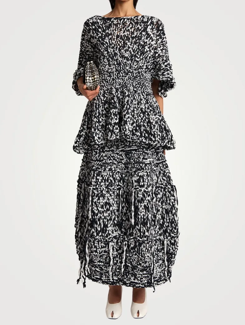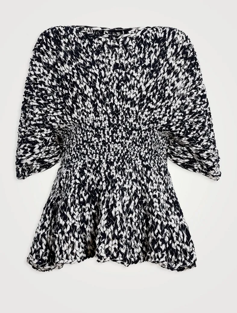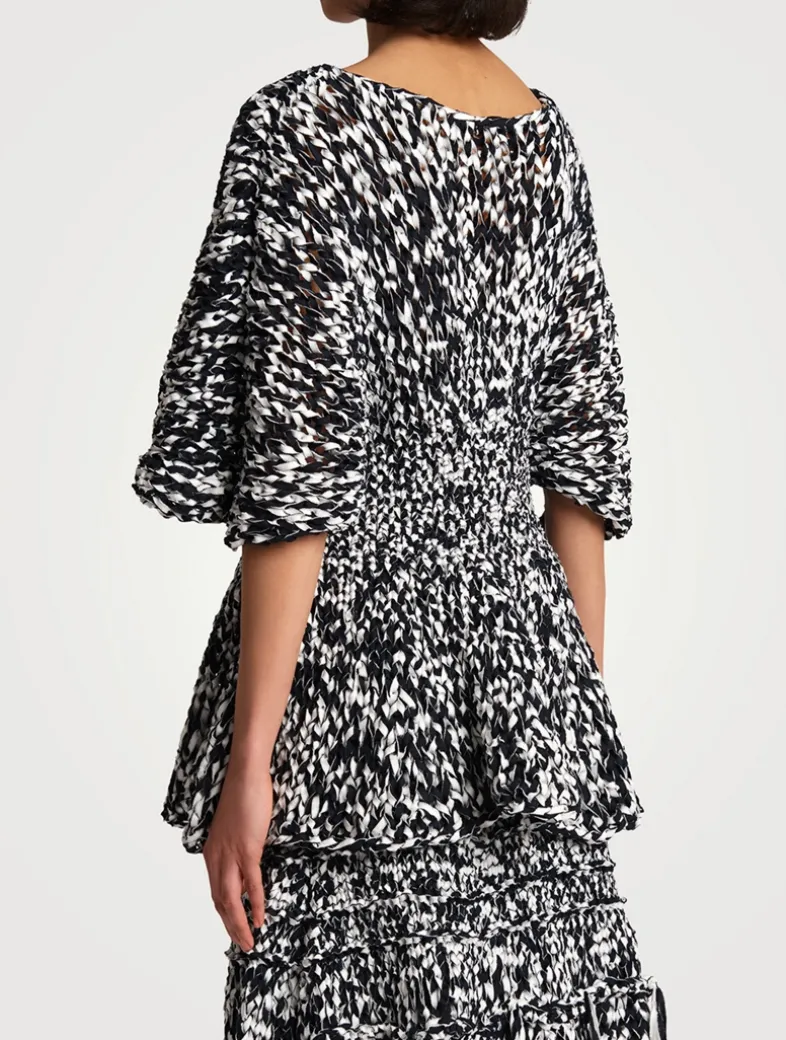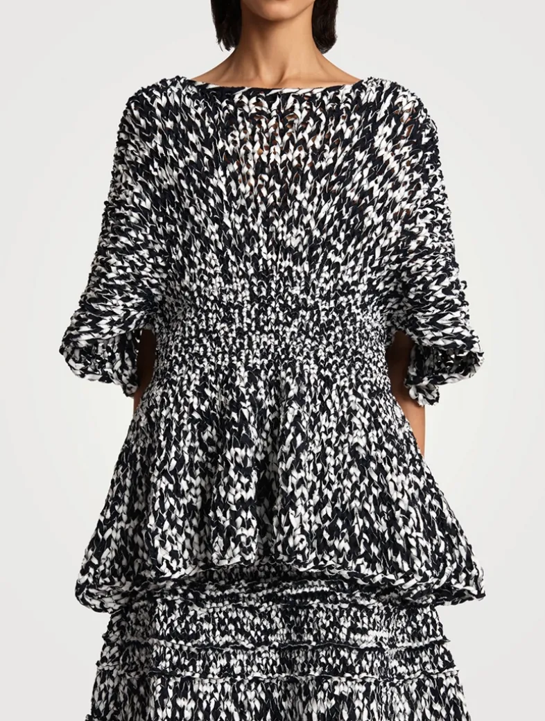 This top has a softly structured silhouette. Crafted from woven strips of fabric, it has a flattering bateau neckline and voluminous elbow-length sleeves. It has a smocked waist that falls to a subtle peplum hem.
