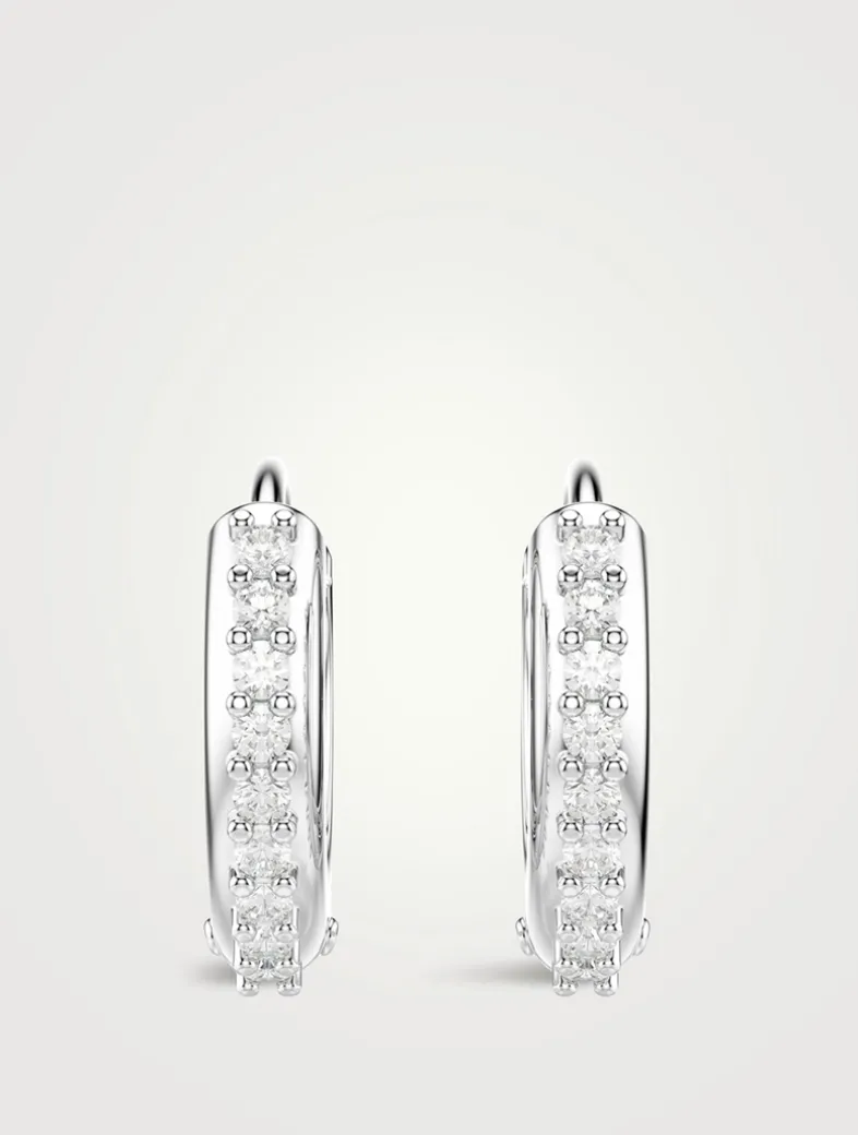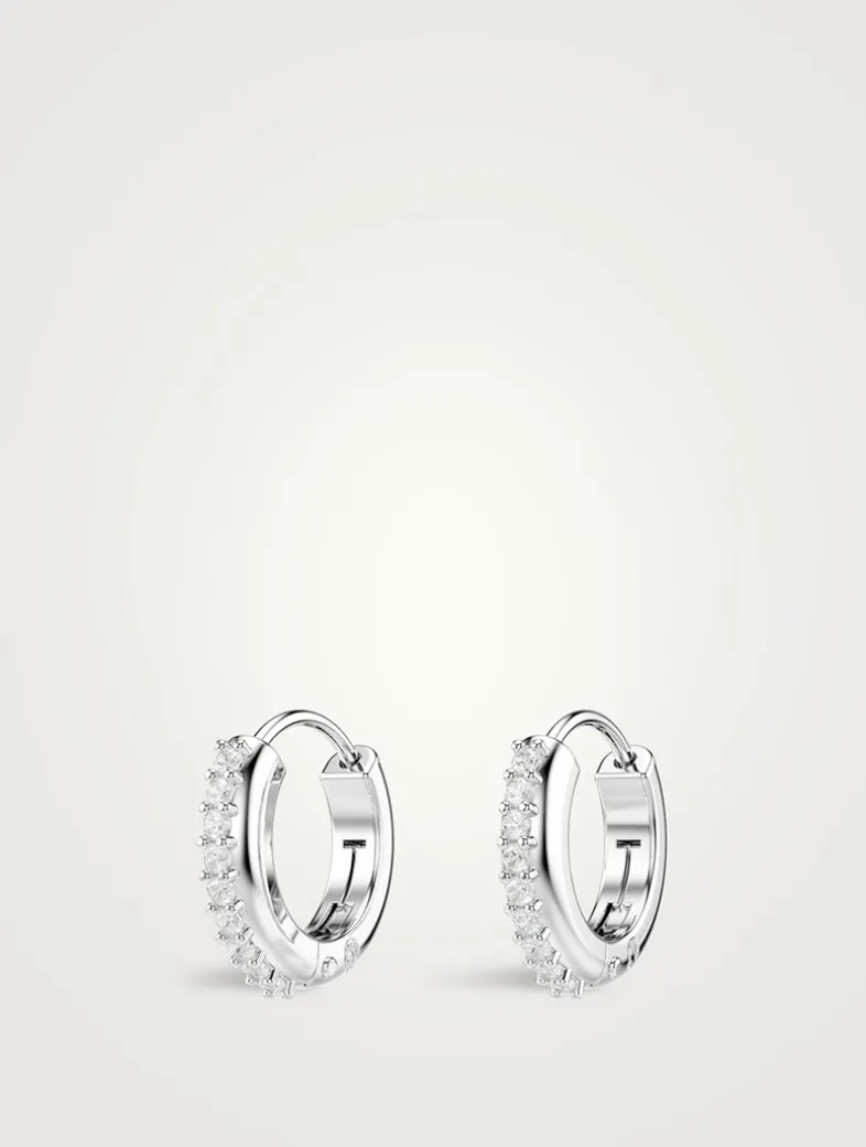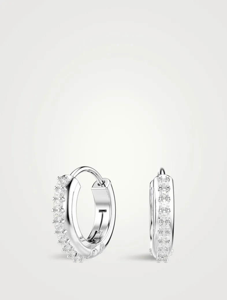 Ignite your style with these shimmering mini hoops. The pierced earrings are rhodium plated and adorned with clear prong-set Swarovski Zirconia on the outer section.