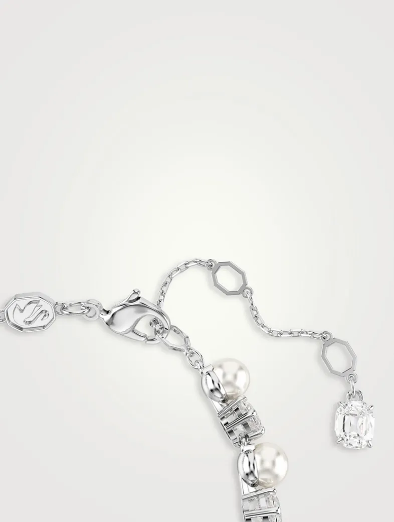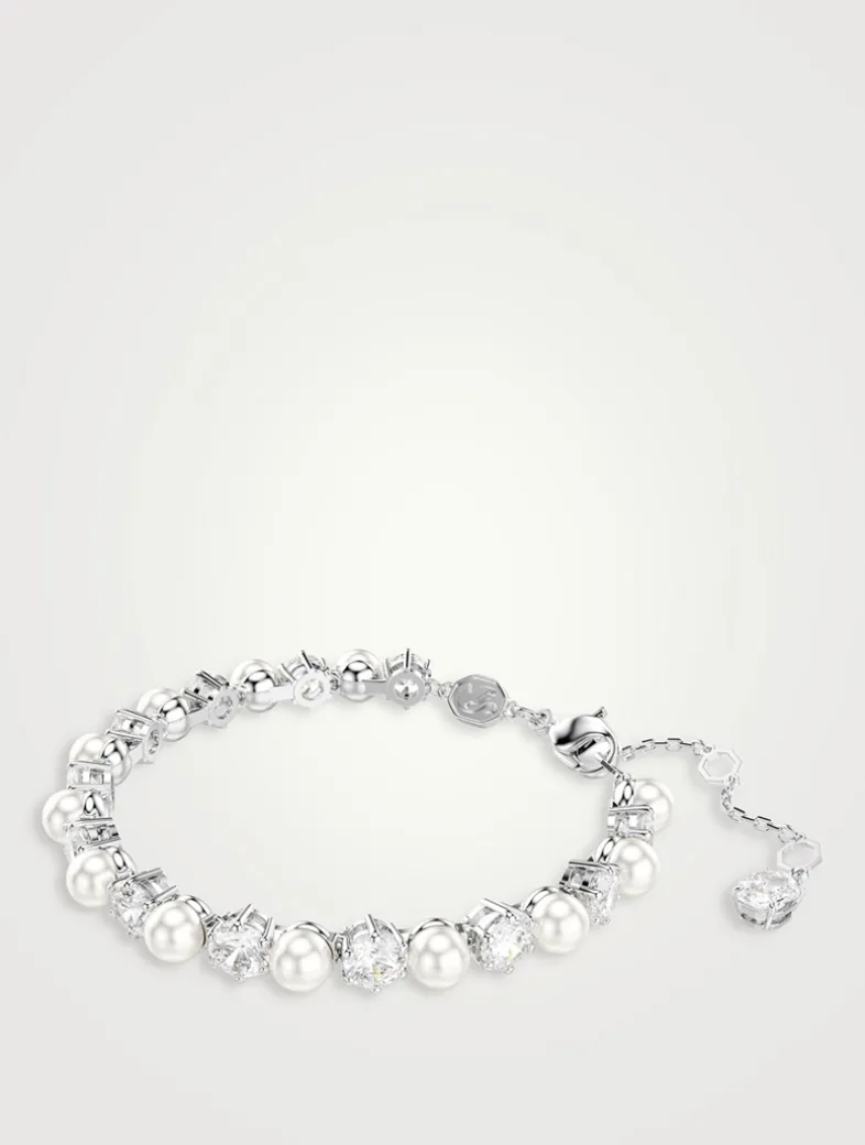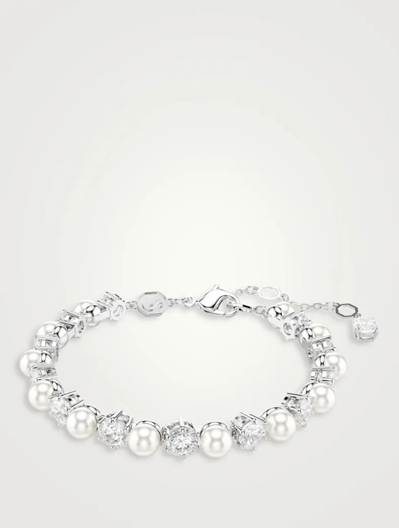 This rhodium plated design is crafted with a full surround of alternating Swarovski Zirconia and Swarovski Crystal Pearls, providing a modern twist of pure sophistication. The innovative closure further heightens the precision, providing a secure fit around the wrist.