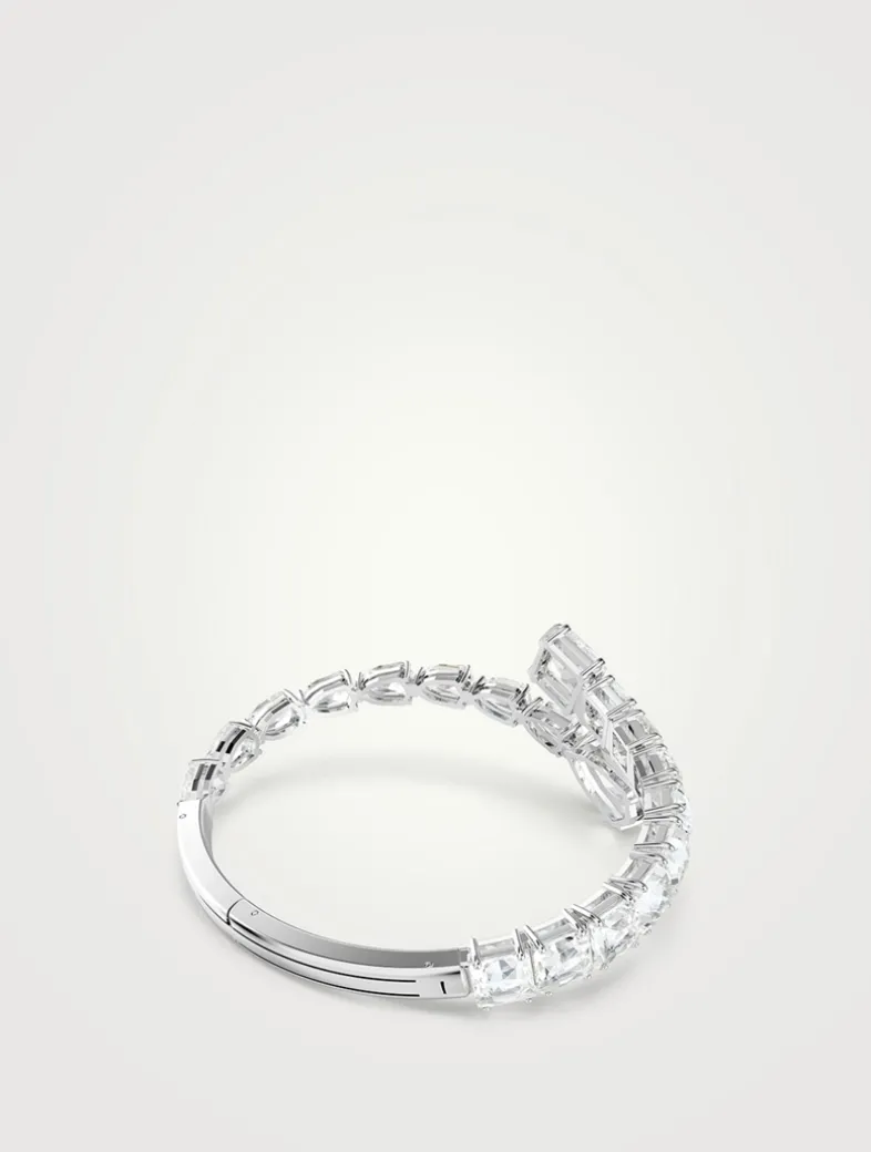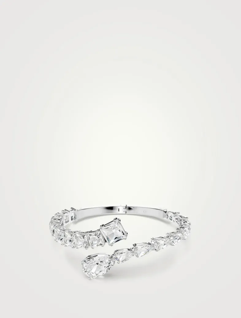 Dial up the intensity with this spectacular Matrix cuff. The rhodium plated design is adorned with an array of clear crystals in pear and square cuts, with multiple sizes adding unexpected dimensions to the silhouette. A Wonderclick closure ensures an easy fit.