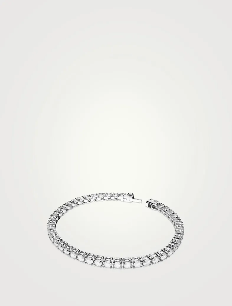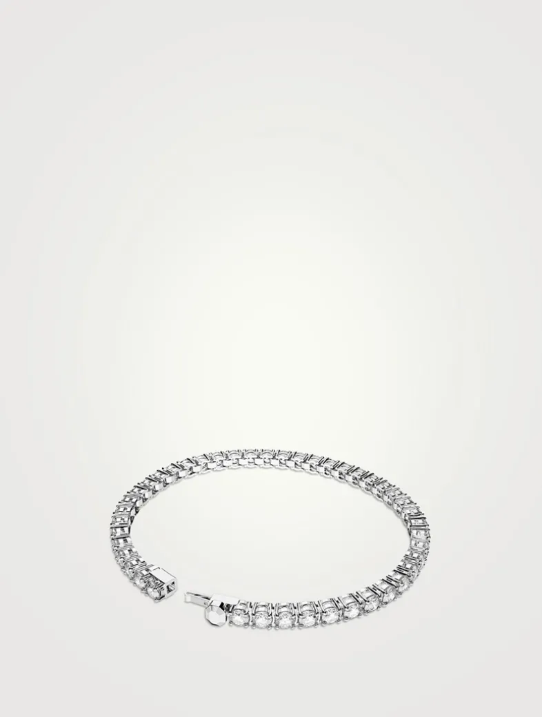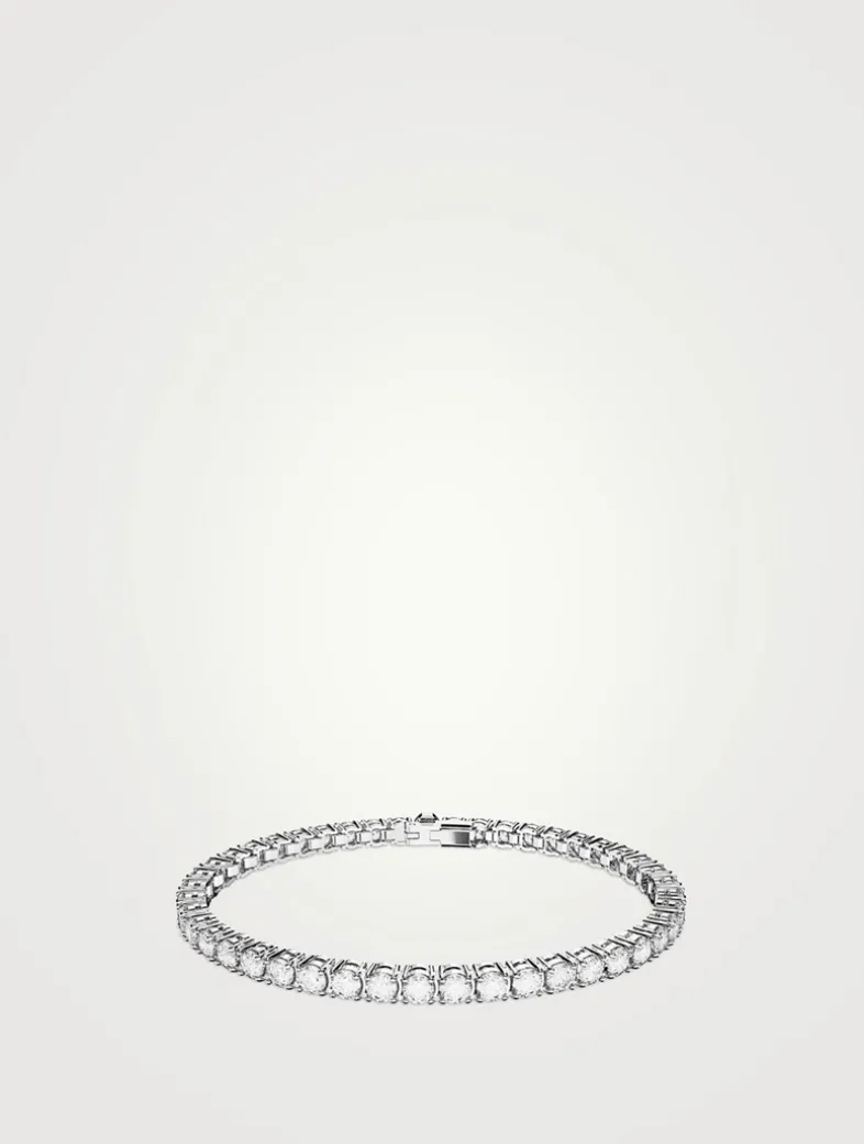 Petite round-cut stones define this bracelet from SWAROVSKI’s Matrix collection. Set in rhodium plated metal, this elegant statement has a hidden barrel clasp for a uniform look.