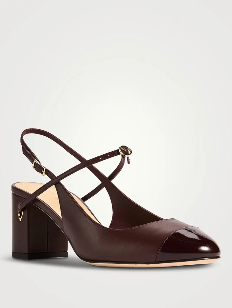 These pumps are handcrafted in Italy from nappa leather with a patent toe and comfortable 65mm block heels. The slingback can be worn two ways: with or without a fine leather strap threaded through Jennifer Chamandi’s signature ‘Eye of the Needle’ heel detail and buckled across the foot.