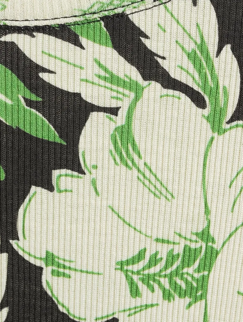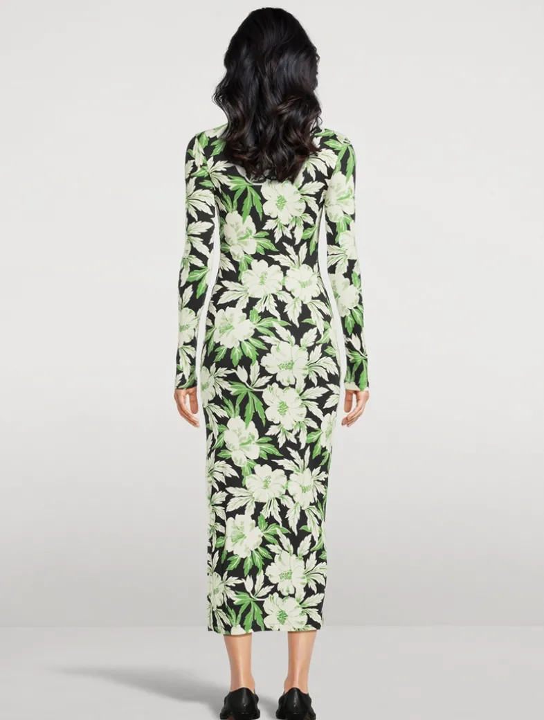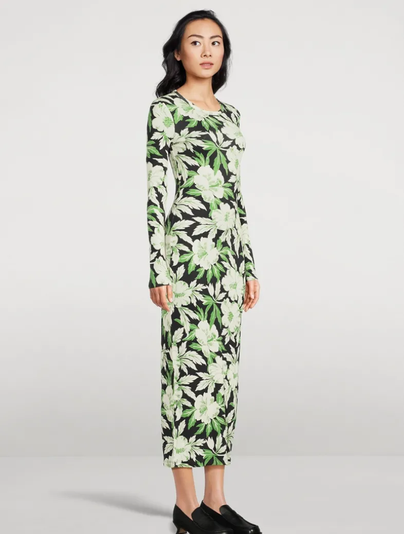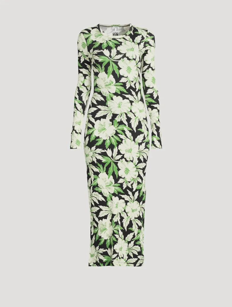 Crafted in a lightweight ribbed silk and cotton blend, this dress features an allover Hibiscus floral print. It is cut to a curve-hugging silhouette with a rounded neckline and long sleeves. Finished with Anagram embroidery placed at the back.