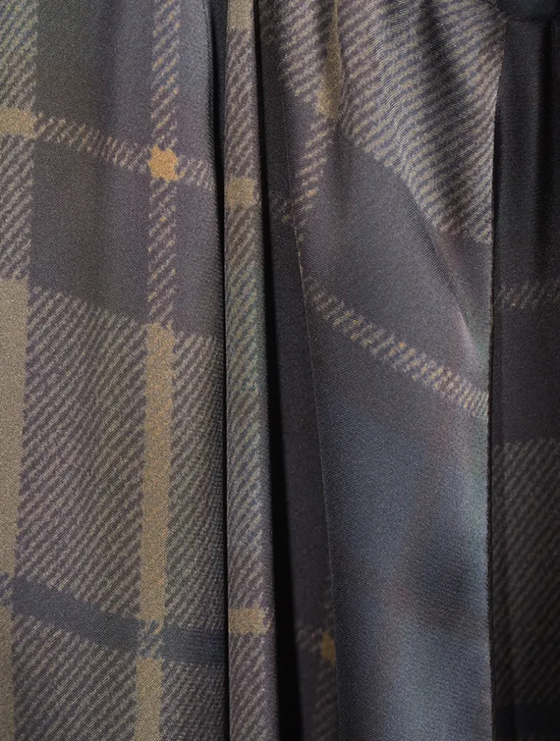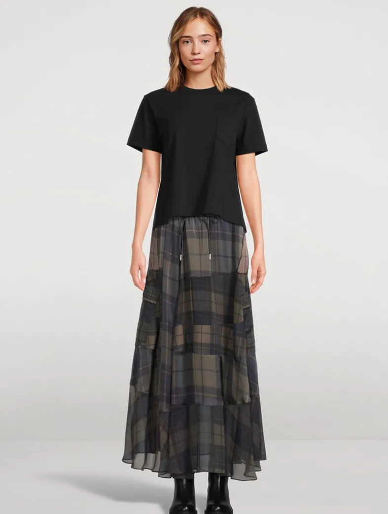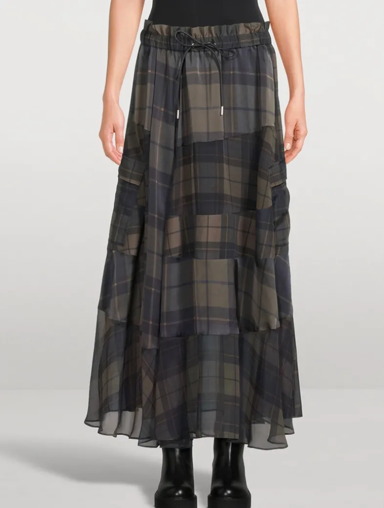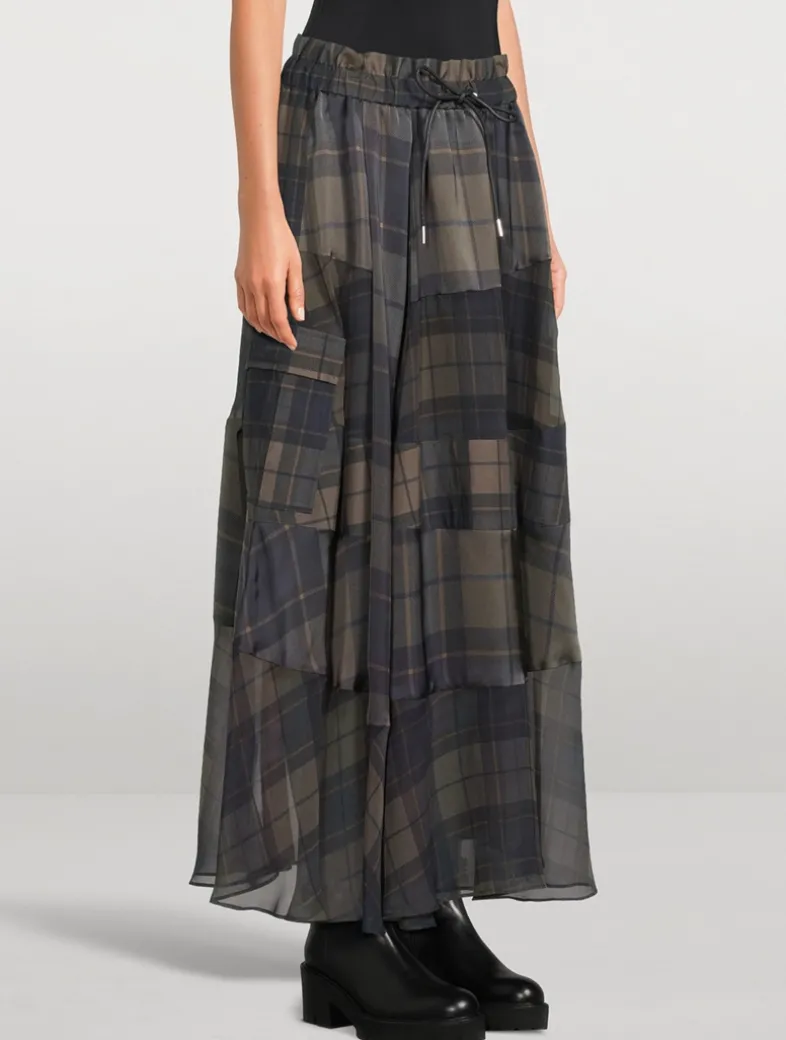 This fluttering skirt has a semi-sheer construction printed with a classic plaid motif. It is topped with a paper-bag waist with an adjustable drawstring.