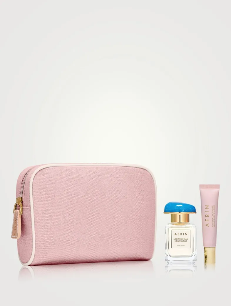 The essentials for any holiday or weekend getaway. AERIN’s bestselling eau de parfum is paired with nourishing Rose Lip Conditioner and tucked into a pretty dusty rose canvas cosmetic bag.