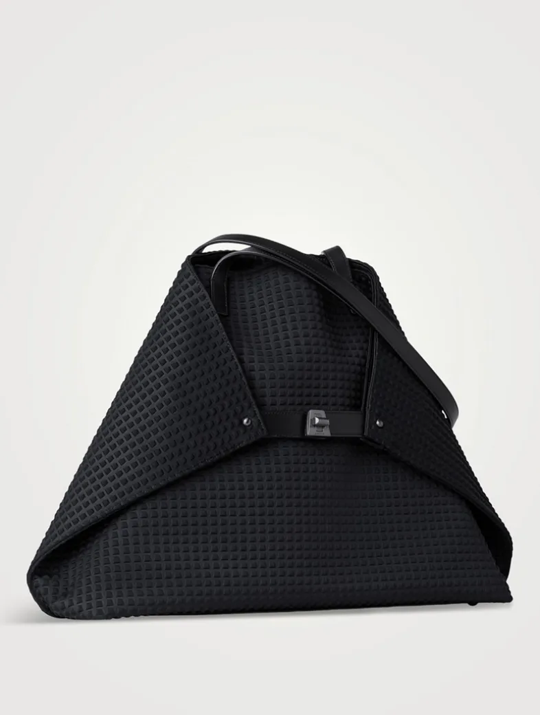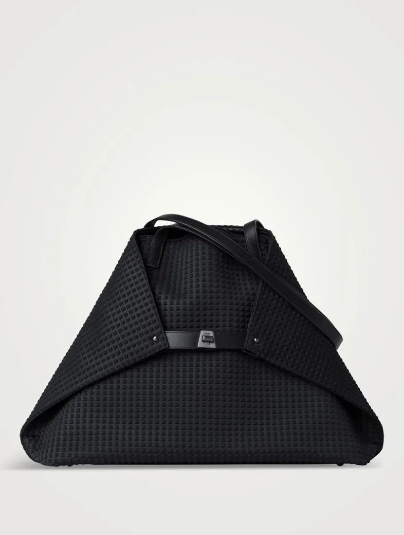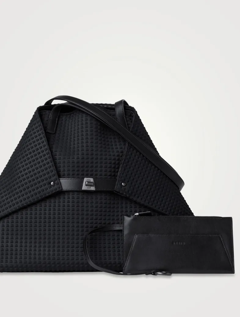 Crafted from a techno fabric, this shoulder bag is at the core of the Akris handbag collection. Versatile and timeless, the Ai is a work of art with great functionality, offering three convertible looks: When opened, it is a rectangular shopper, with the corners folded inside and secured with the turn lock, with the corners folded on the outside and closed with the turn lock. The medium bag features one inside zip compartment, two organization pockets, and includes a removable leather zip pouch.
