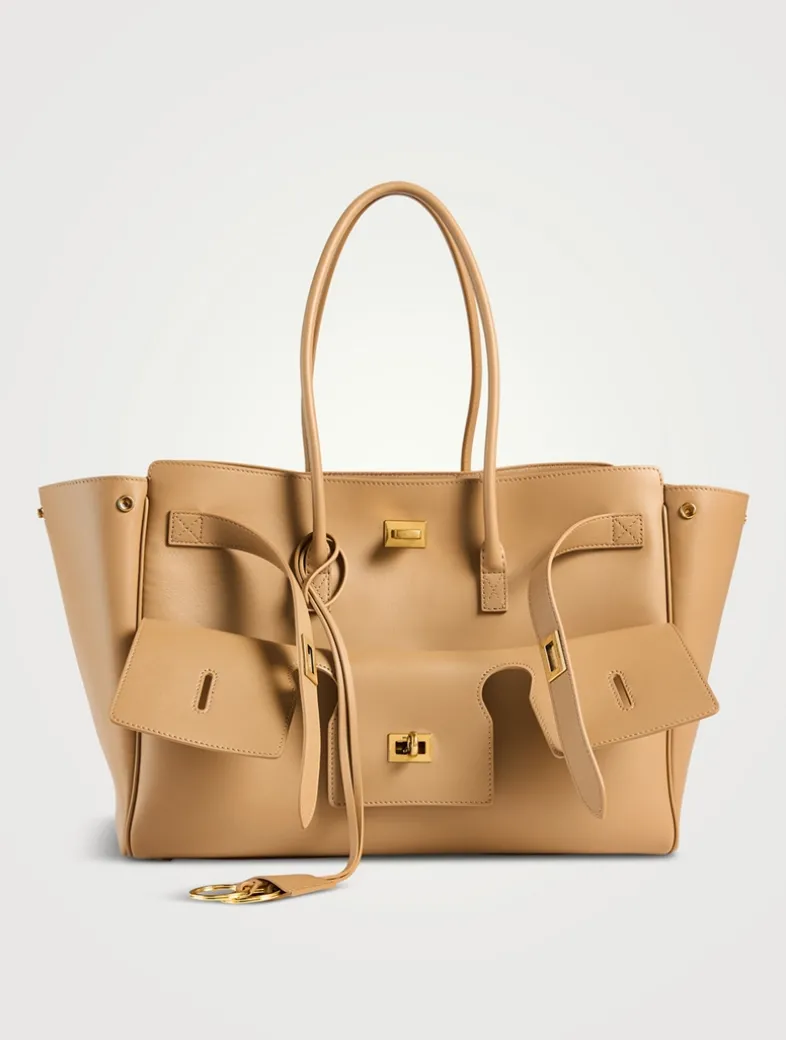 A slouchy design lends a louche touch to this roomy carryall. Crafted in Italy from smooth calfskin, it is embellished with aged gold-tone hardware. It has snaps at the sides to adjust the shape of the main compartment, while the interior has two zipped pockets and two flat pockets.