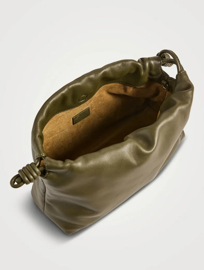 The Flamenco purse is a lightweight and soft bag with a ruched shape, historical knot drawstrings, and a donut chain. This medium version is crafted in mellow nappa lambskin with a suede lining. It has a detachable donut chain with Anagram Pebble and a detachable and adjustable leather strap for multiple carry options.