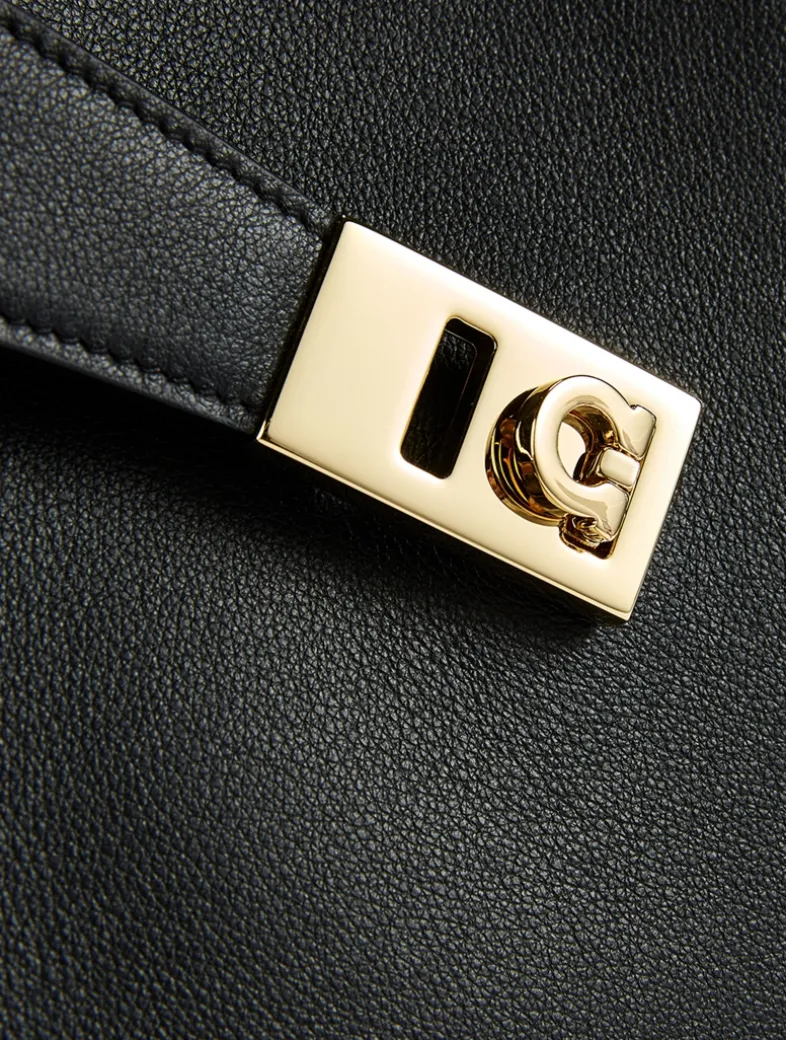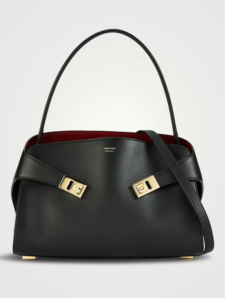 This shoulder bag features the distinctive enveloping shape of the Hug in a deconstructed version. Made of calfskin it features a single handle for a softer silhouette on the front panel, which is decorated with gold-tone Gancini buckles. Closed with an internal flap equipped with magnets and a practical T-bar, this version features a contrasting lining for a refined colourblock effect. The central zipped compartment divides the interior into perfectly organized sections. Adjustable and detachable strap for multiple styling options.