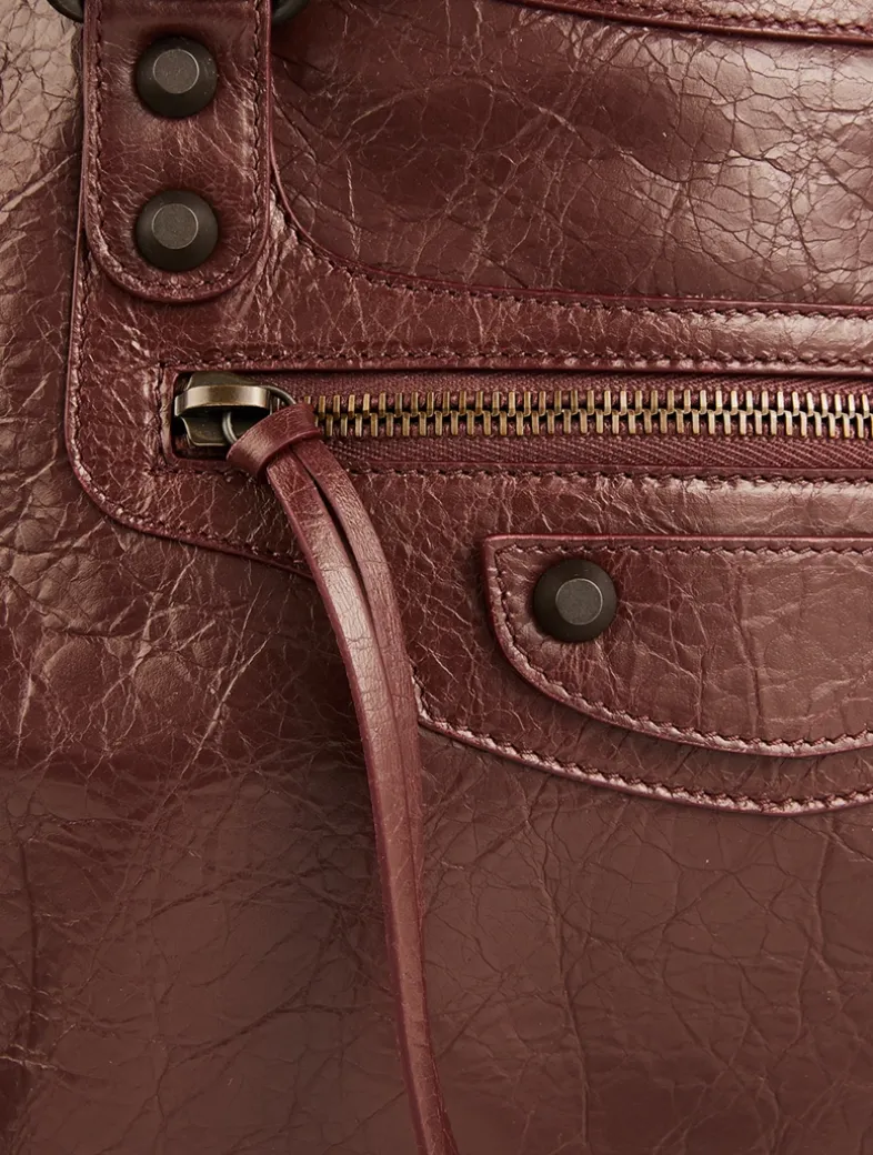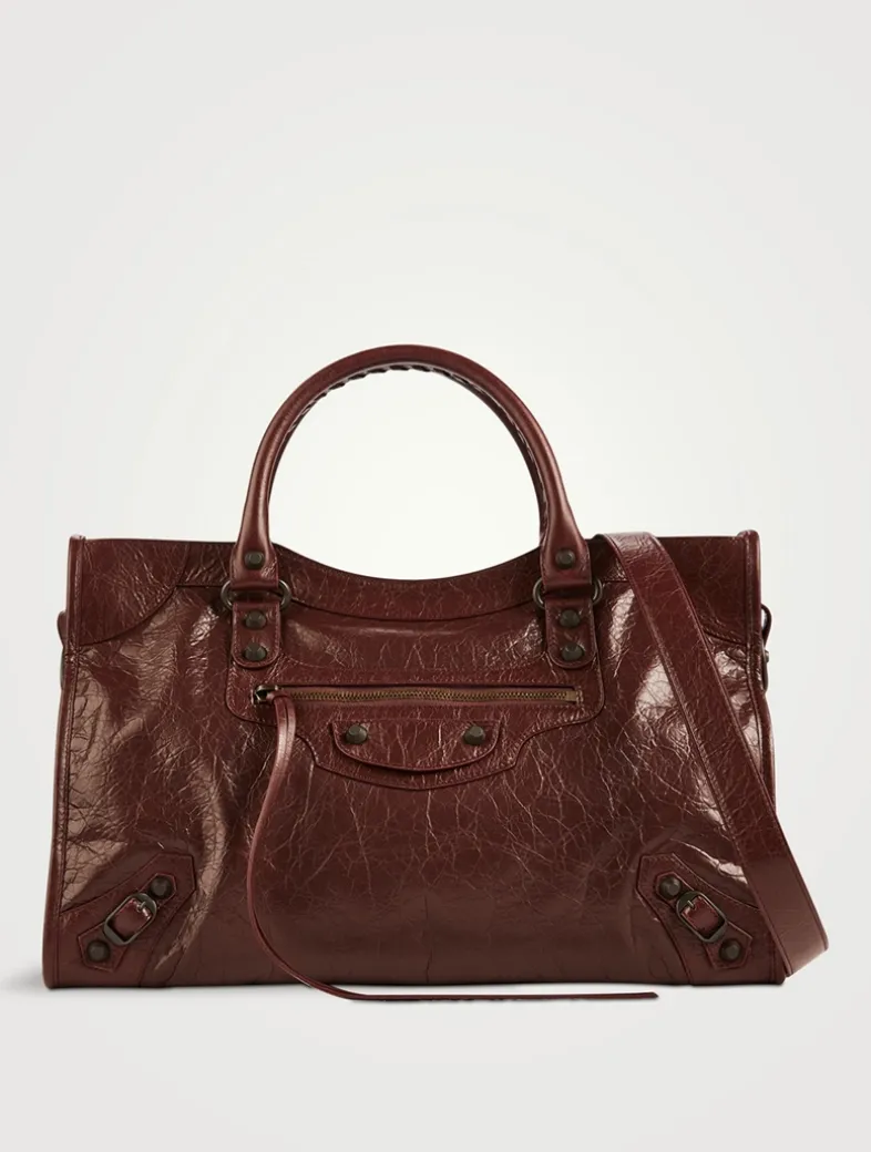 Nodding to Balenciaga’s iconic moto-inspired styles, this handbag is crafted from Arena Storico leather embellished with metal studs and buckles. It has two hand-braided handles and a removable and adjustable shoulder strap for multiple carry options. Finished with one zippered interior pocket.