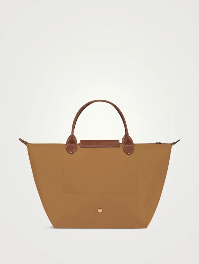 This handbag is incredibly lightweight, boasting classic clean lines and a feminine touch. With its two leather handles and snap closure, it can be carried by hand or folded up into the size of a paperback book in the blink of an eye. Crafted from polyamide fabric with a minimum of 70% recycled fibers, with an interior nylon coating. Large enough to carry a laptop, it is finished with two interior pockets.