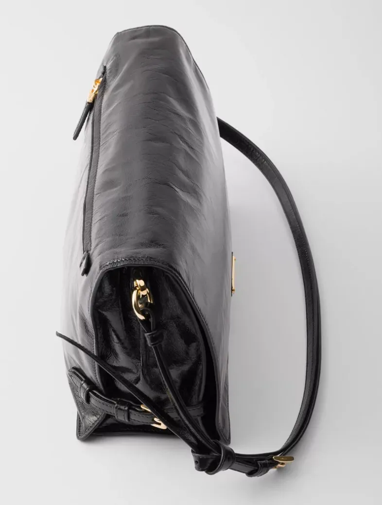 Leather handle, drop 30 cm Back zipper pocket Metal hardware Enameled metal triangle logo on the flap Flap closure Logo-print nylon lining with two compartments and center pocket