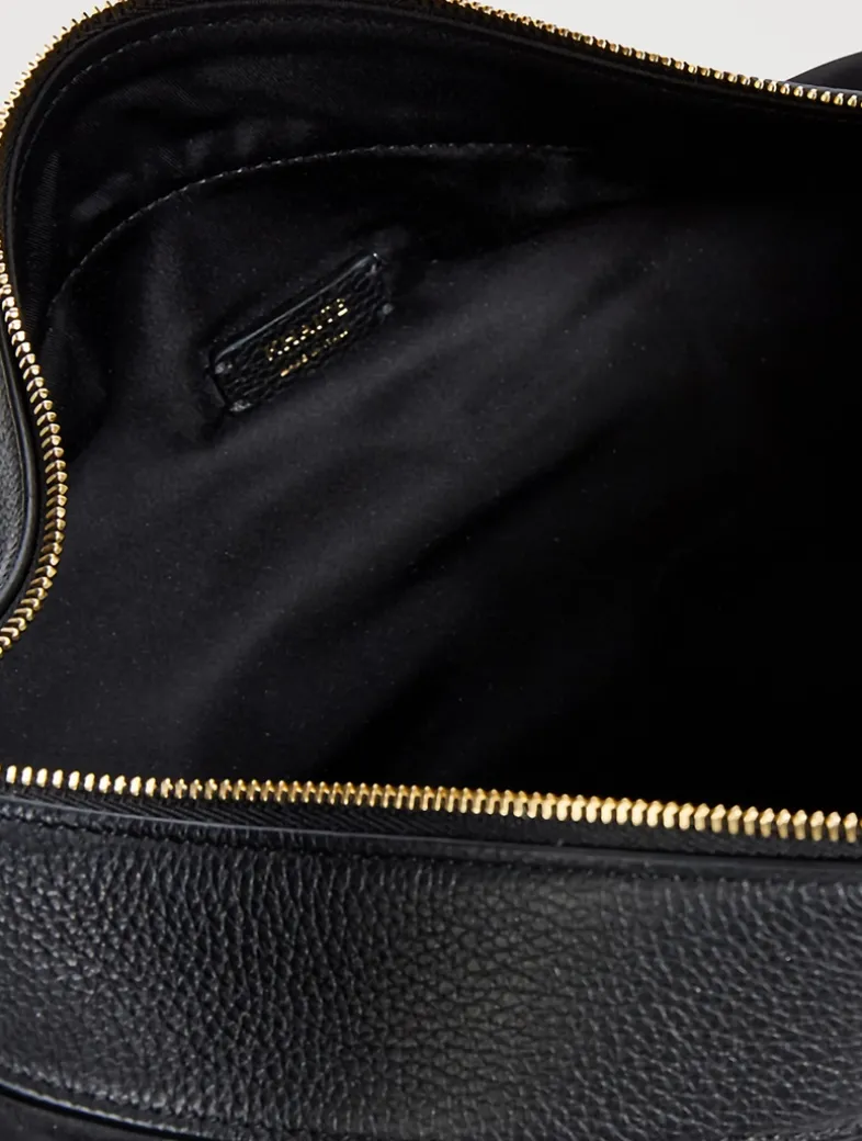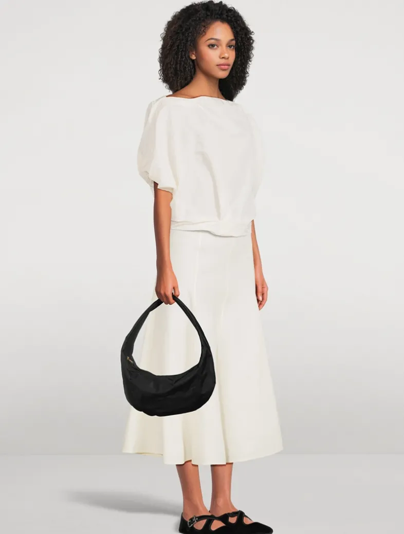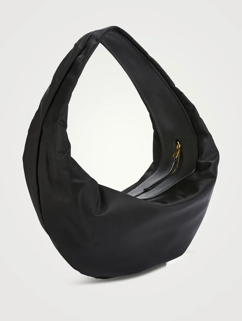 A slouchy bag in sleek nylon paired with calfskin. With an integrated strap to wear over the shoulder or carry by hand, the rounded bag is finished with a slip pocket at the interior.