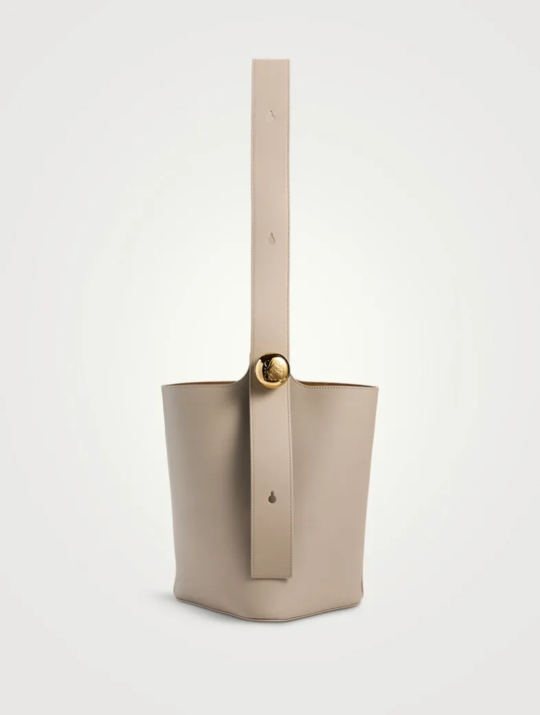A novel and innovative bag silhouette, the Pebble combines pure minimalistic lines with a strong design statement. At once ornamental and functional, the signature Anagram-engraved hardware allows to adjust strap length and suit a number of carry styles. The distinctive twisted construction is complemented by subtle elevated details. This medium version is crafted in mellow calfskin with bonded leather lining.