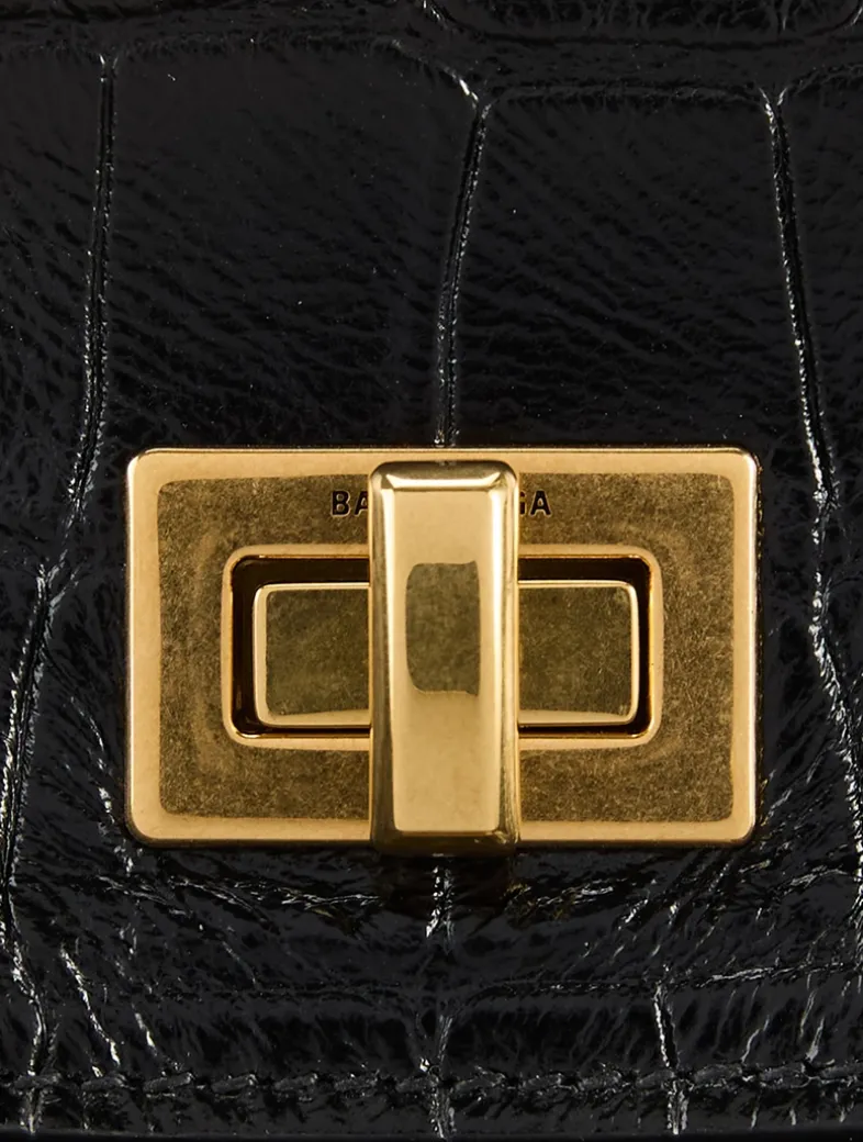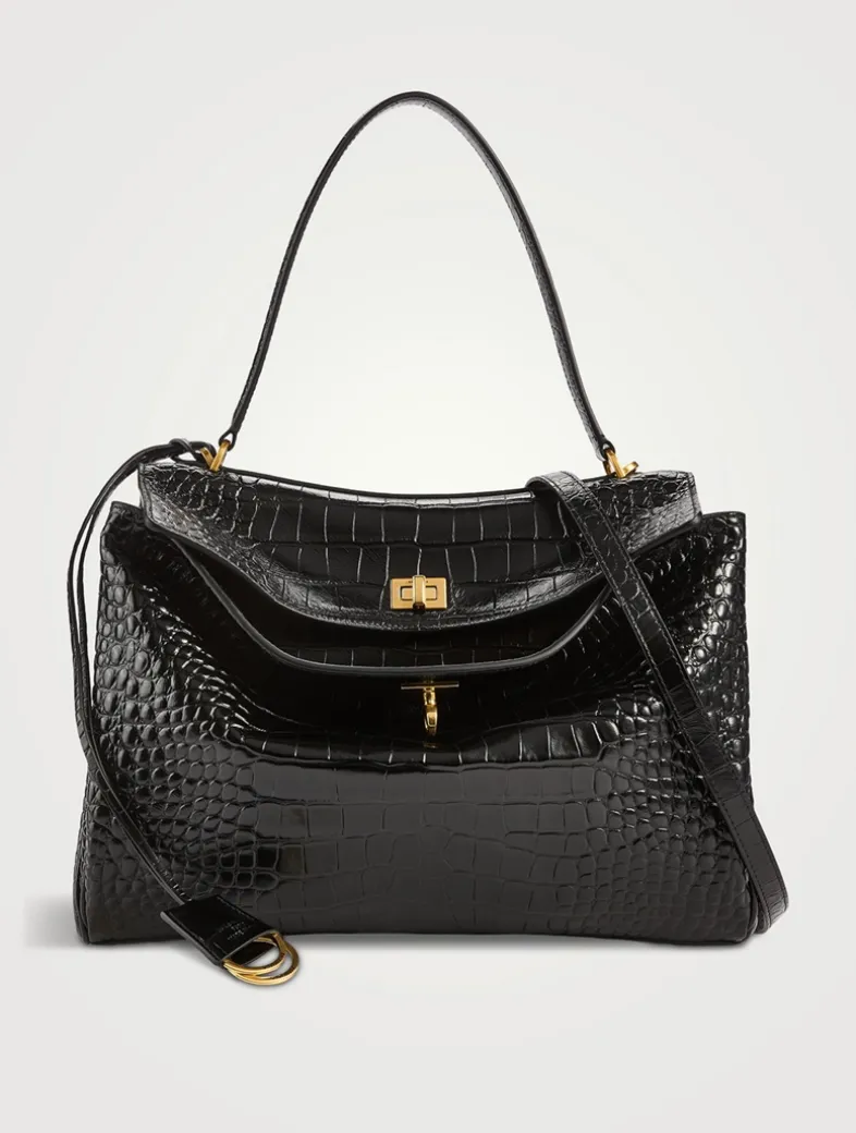 A croco-stamped leather construction and side snaps enhances the slouchy shape of this bag. Roomy enough for you daily essentials, the satchel features one main compartment, one inner zipped pocket, and two flat pockets at the back.