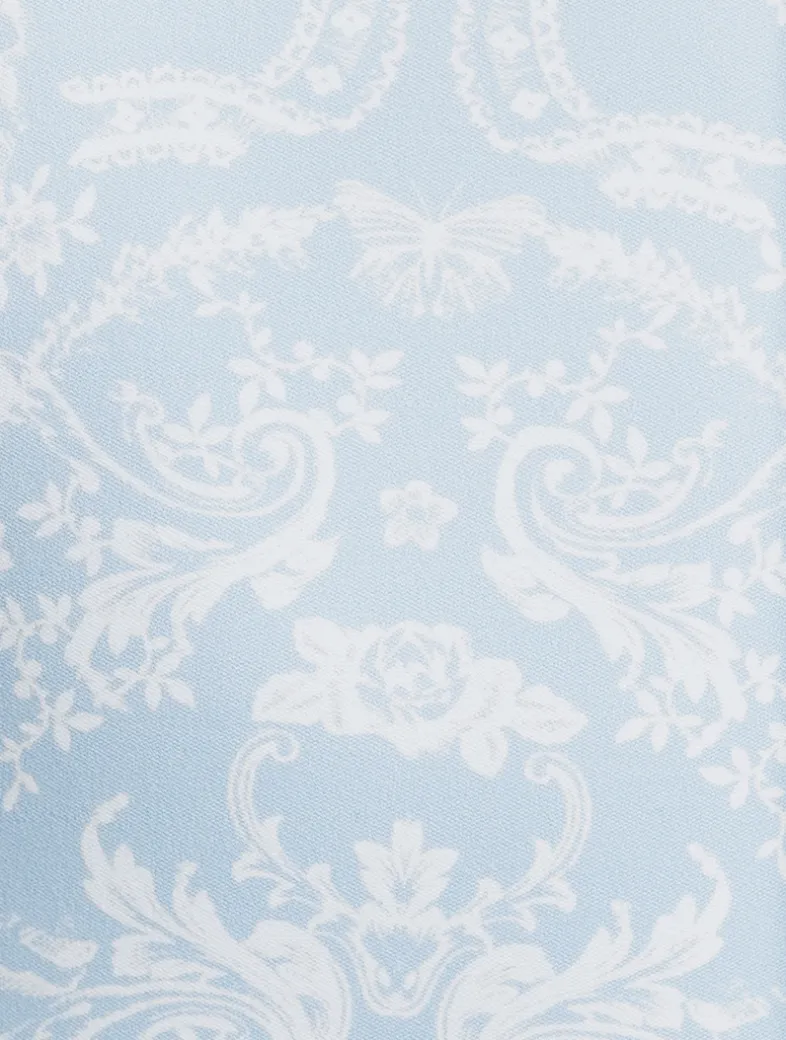 This flirty one-piece swimsuit debuts with a printed toile with embroidery details. The maillot has self-tie straps around the neck, embroidered stitching around the neck and arm holes, coverage at the back, and a plunging neckline.