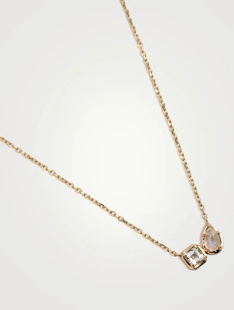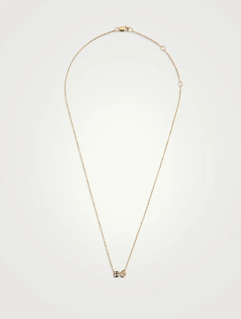 Toi et Moi, meaning you and me, a historic style that symbolizes love stories and partnerships. This necklace features a square and pear shaped stone sitting side by side in a vintage-inspired gold setting.