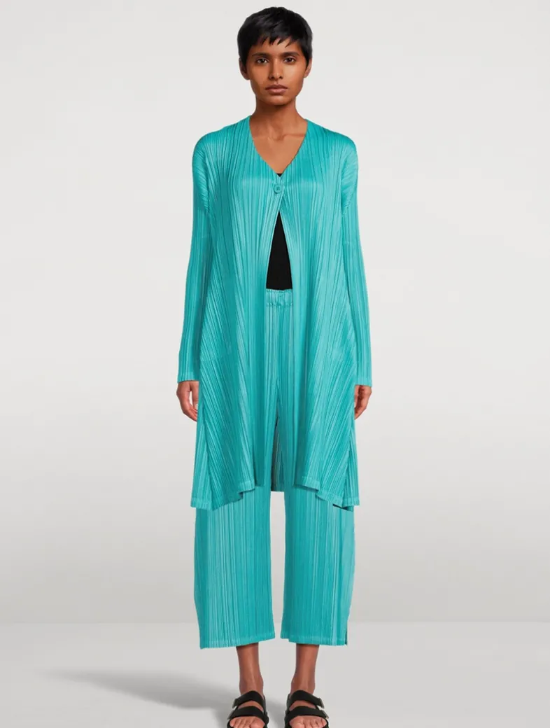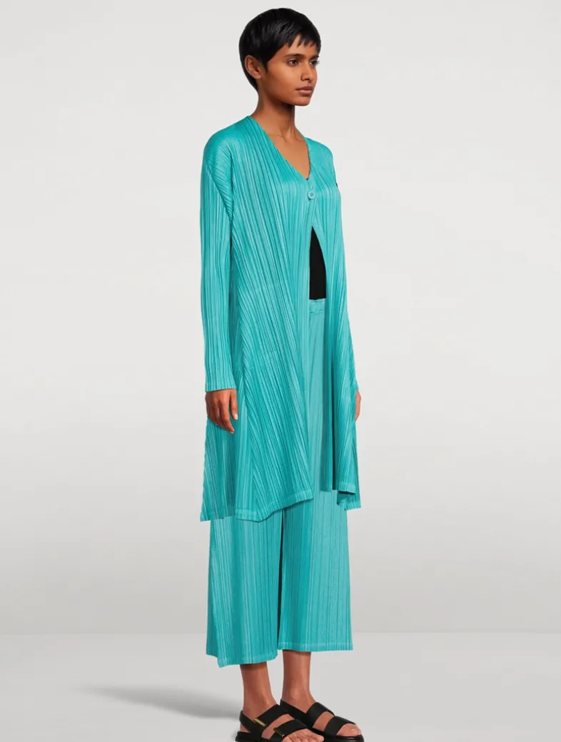 This long cardigan is made from soft-textured fabric. Pleats are added after folding the sides, creating a flared silhouette that gives an elegant impression. It has a buttoned design and pockets on both sides.