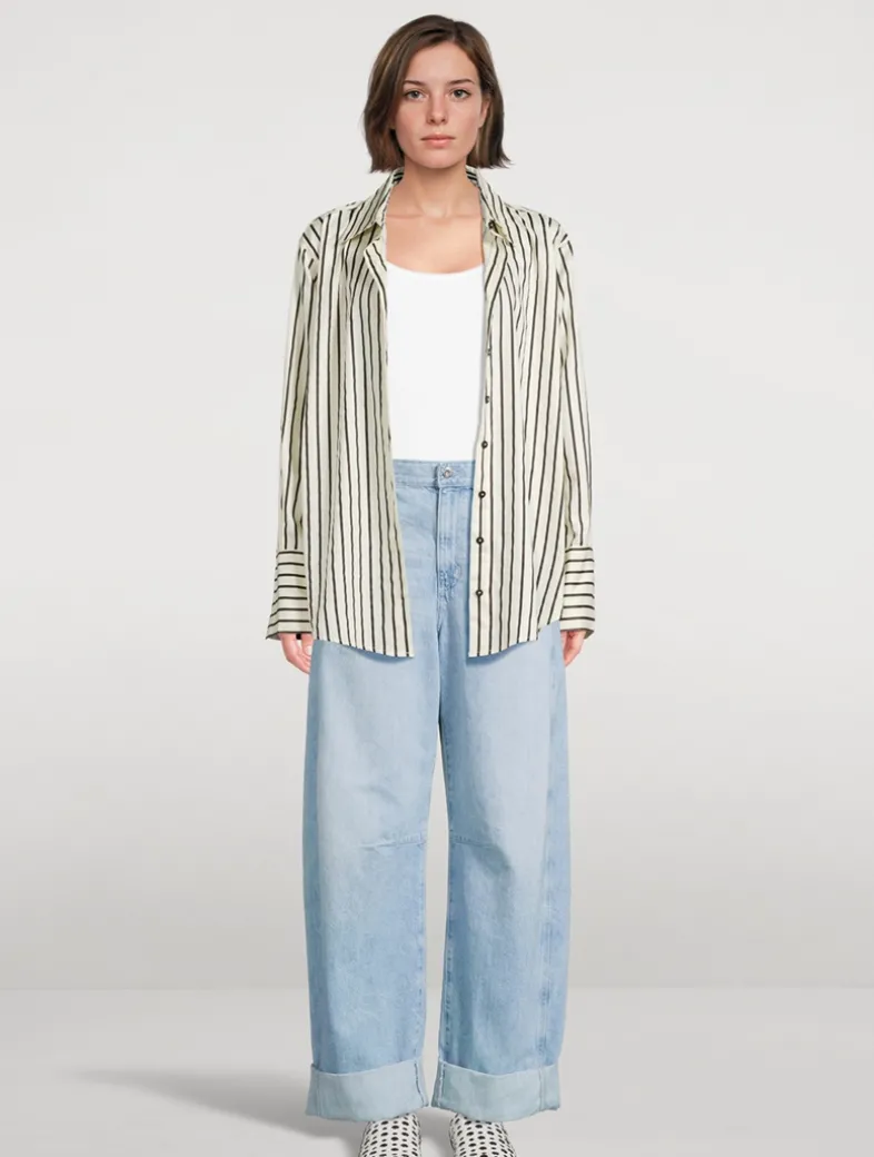 The Mercer barrel-leg jeans have on-seam hip pockets, darted knees, and double-cuffed hems. Featuring a high-rise waist, the distinctive silhouette has a loose top block and a curved outseam.