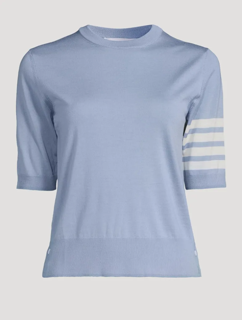 Cut in a slim silhouette, this short-sleeve pullover has a fine wool-blend construction with four-bar stripe detail at the left arm. Buttoned side vents highlighted with signature striped grosgrain trim.