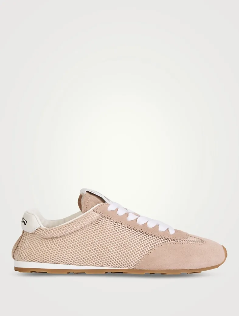 Refined suede workmanship and delicate mesh meet the sleek and extremely light design of these Miu Miu sneakers. Printed with the brand’s logo on the tongue and on the heel.
