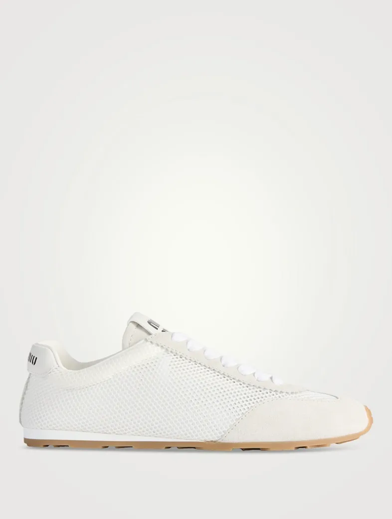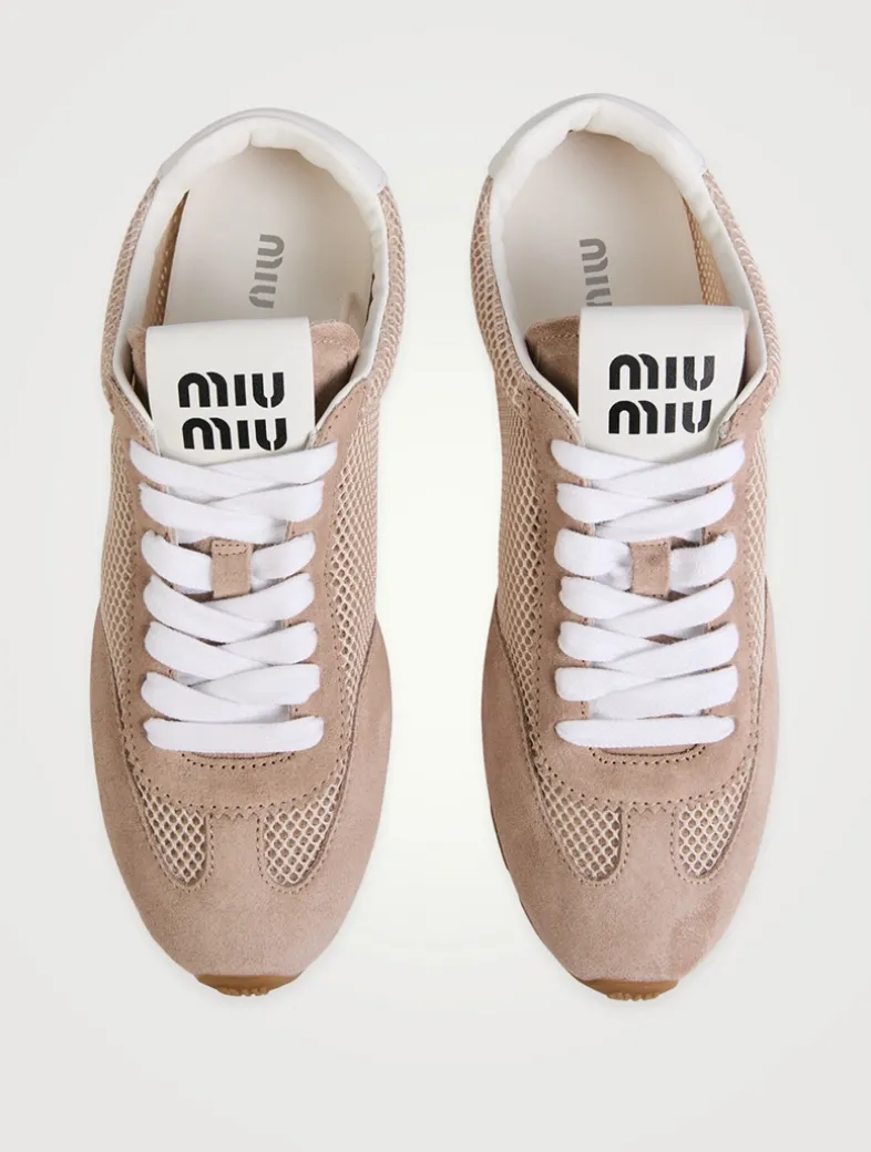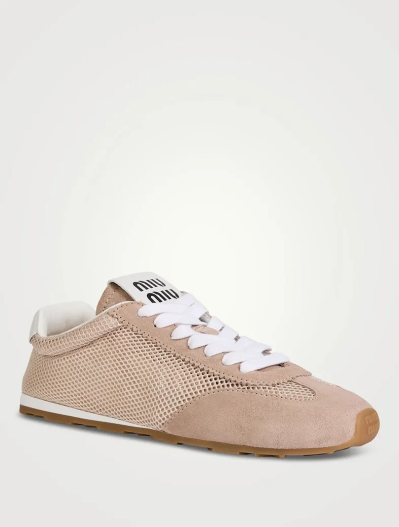 Refined suede workmanship and delicate mesh meet the sleek and extremely light design of these Miu Miu sneakers. Printed with the brand’s logo on the tongue and on the heel.