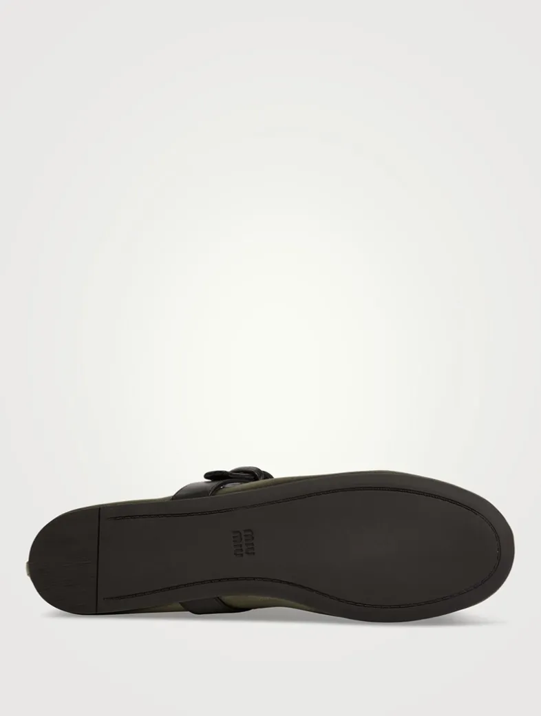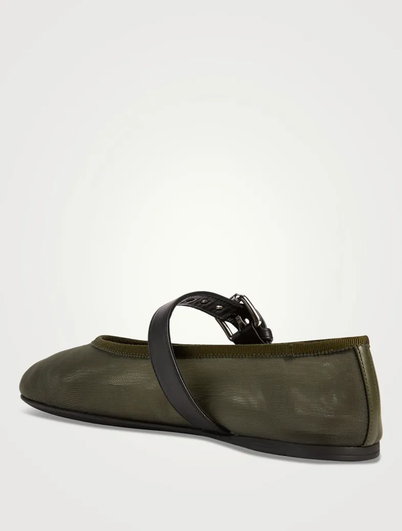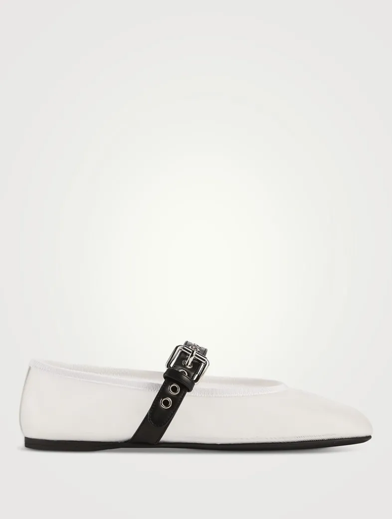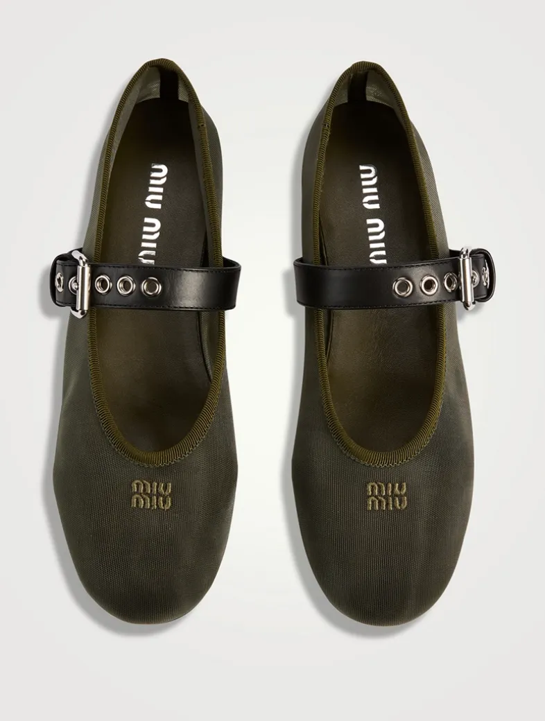 The iconic allure of the Miu Miu ballerina flat finds new expression in this summery mesh version featuring an elegant texture and bold buckled strap.