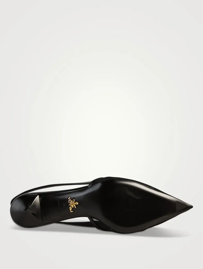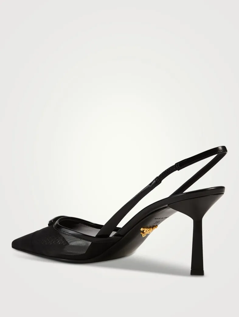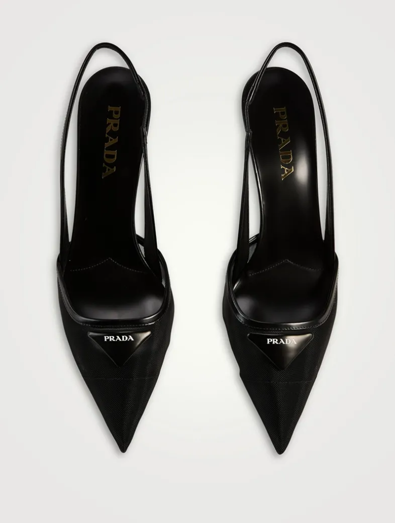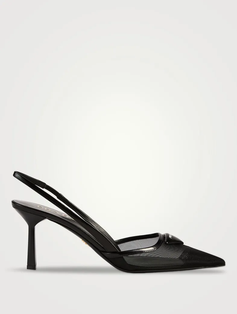 These delicate mesh pumps express feminine, refined elegance with contemporary allure. The triangle logo returns as a slightly padded detail and inspires the geometric line of the heel that enhances the silhouette with a modernist note.