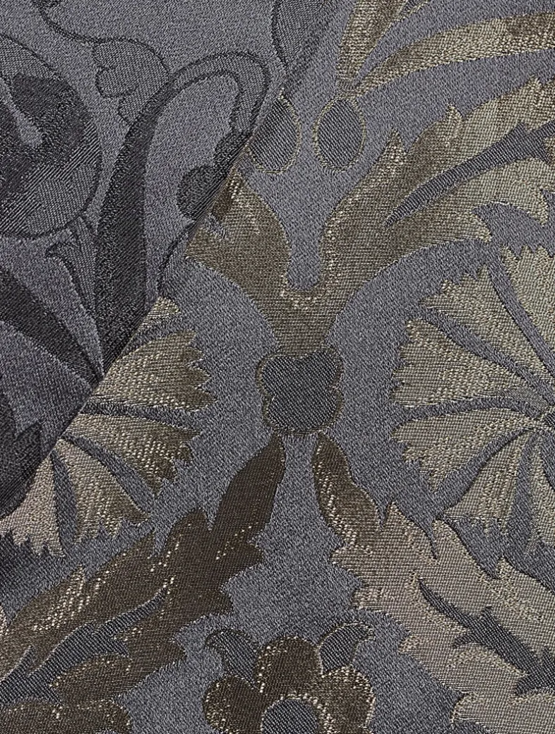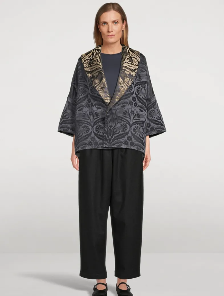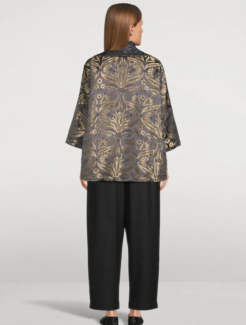 Exuding a evening-ready charm, this jacket is crafted from a silk blend with a shimmering metallic jacquard motif. It is framed by an exaggerated shawl collar and features three-quarter sleeves and a buttoned closure.