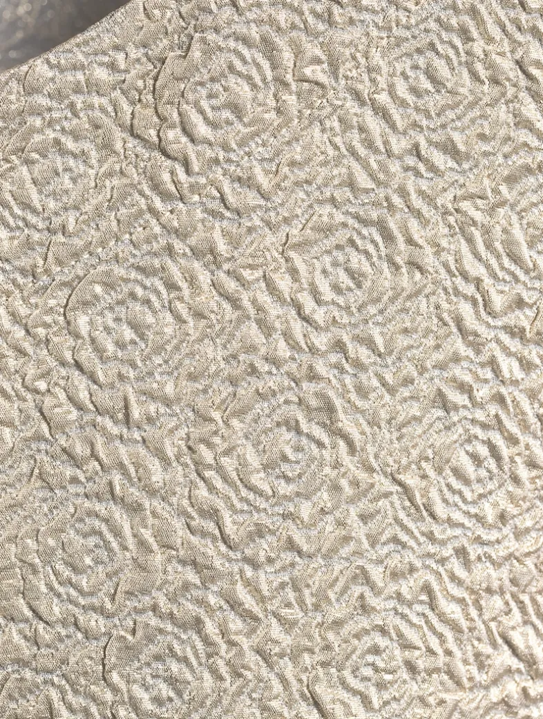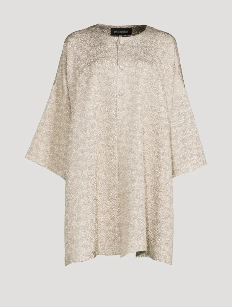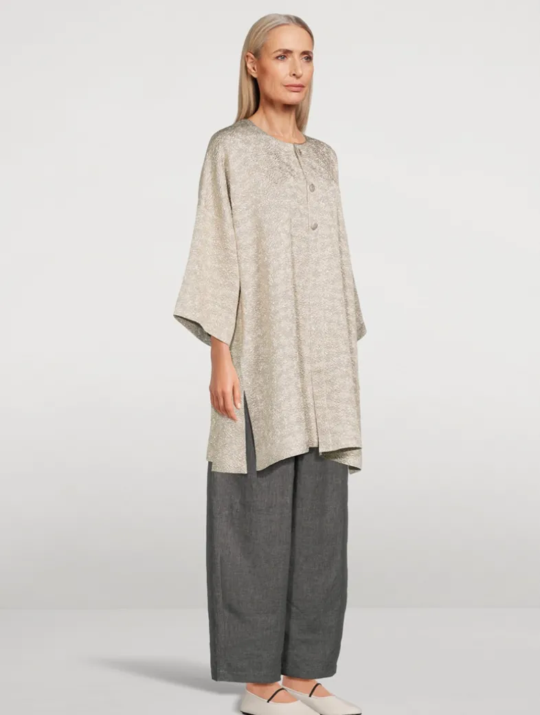Exuding a evening-ready charm, this jacket is crafted from a silk blend with a shimmering metallic jacquard motif. It has a rounded neckline, bracelet-length sleeves, and a button-front closure.