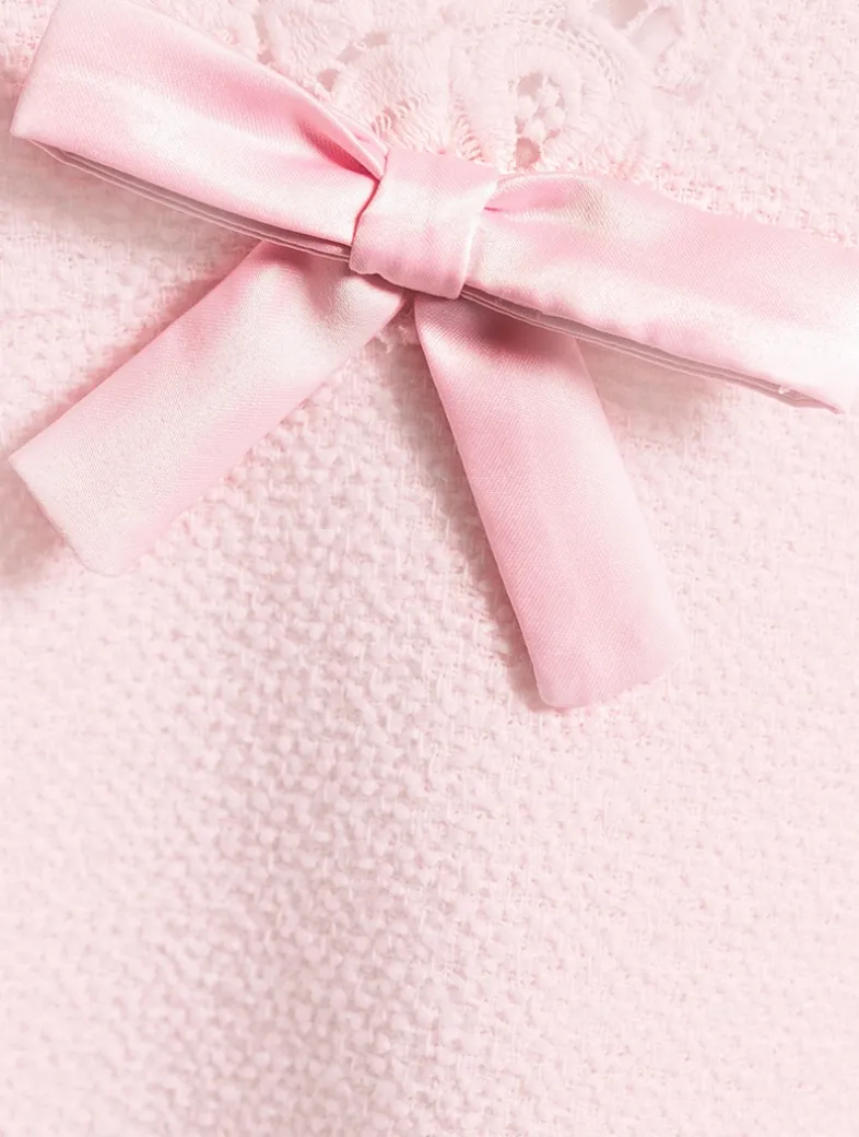 This preppy mini debuts with a polished, tweed fabric featuring custom floral guipure lace at the neckline and hem. It begins with spaghetti straps before falling to an empire waist above a fitted bodice. This piece is finished with a top-applied charmeuse bow at center front and a side seam zipper for functionality.