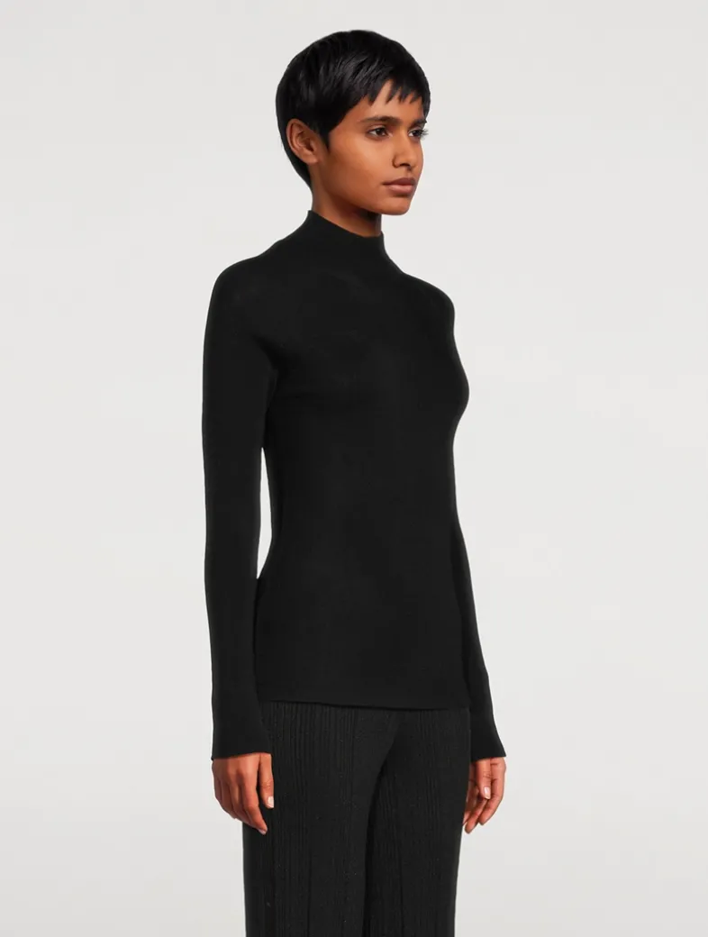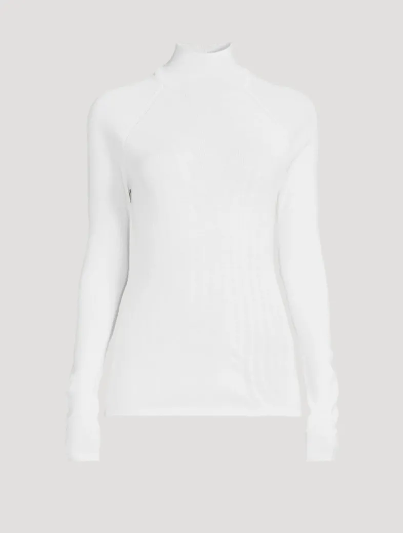 A micro ribbed texture defines this long-sleeve pullover. Crafted from a mix of wool and silk, it has a high neckline, raglan sleeves, and a slim-fit silhouette.