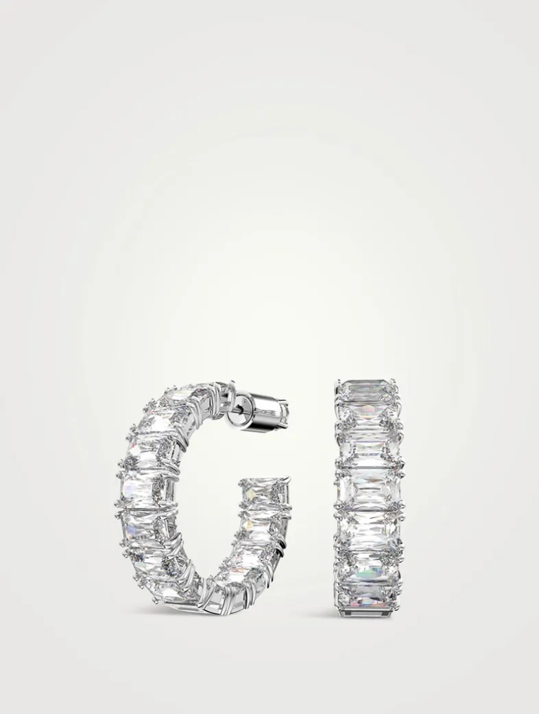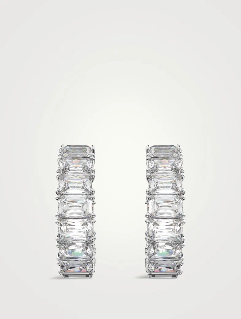 A classic hoop design with a dazzling twist, this elegant pair of crystal earrings features a uniform row of octagon-cut stones cradled in a fine, rhodium-plated frame. These earrings are part of the Millenia family, designed by Creative Director Giovanna Engelbert for Collection III.