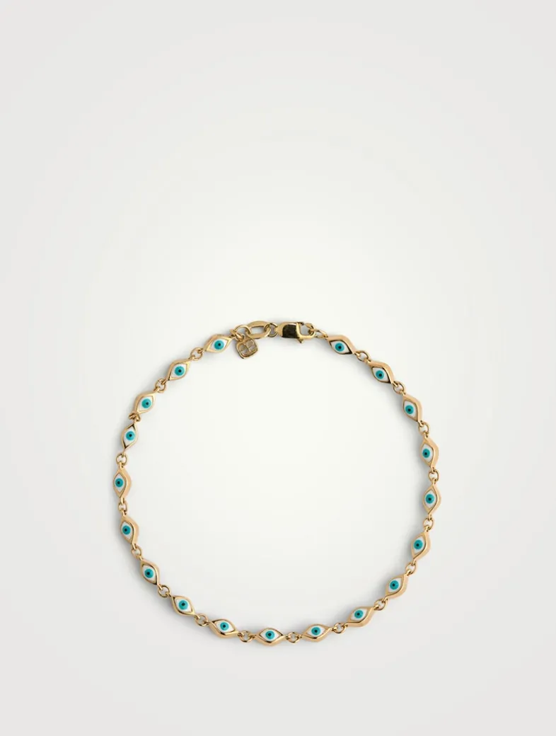 This link bracelet features Sydney Evan’s mini evil eye charm repeated in 14k gold and accented with enamel.
