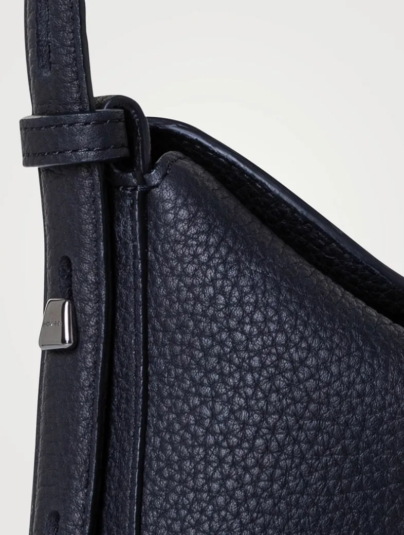 This slouchy bag is crafted from grained leather with a magnetic flap closure and an interior zip pocket. It comes with an adjustable shoulder strap featuring a characteristic trapezoid-shaped ring that provides versatile styling options.