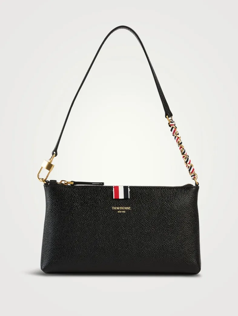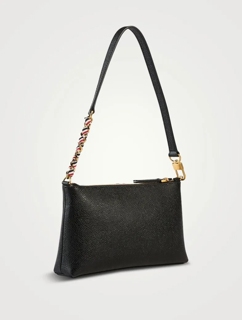 This slim pouch is crafted from grained leather and features a striped fabric lining and a shoulder strap embellished with grosgrain ribbon and chain-link trim.