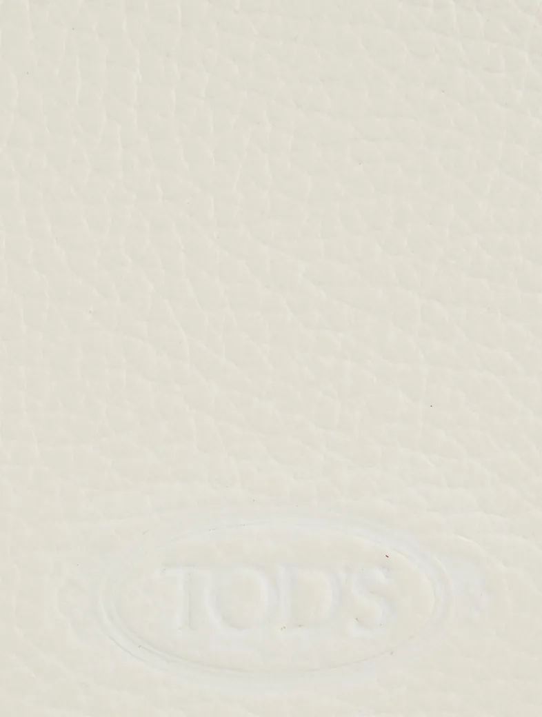 Roomy tote bag in soft exposed grain leather, with Tod’s logo stamped on the front, flat handles, and a removable shoulder strap. The interior comes with three compartments separated by zipped central pockets. An elegant creation enhanced by distinctive iconic detailing, such as the metal T Timeless pendant and T-stitching.