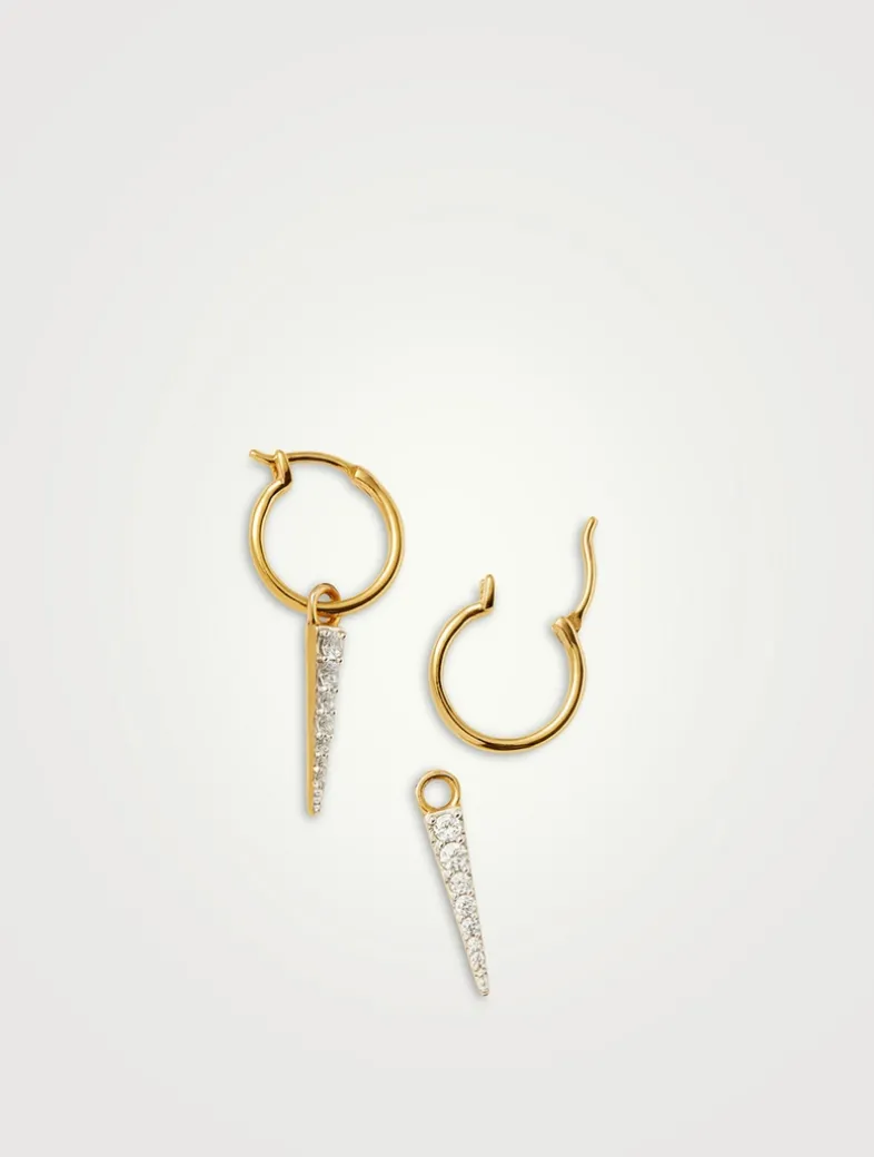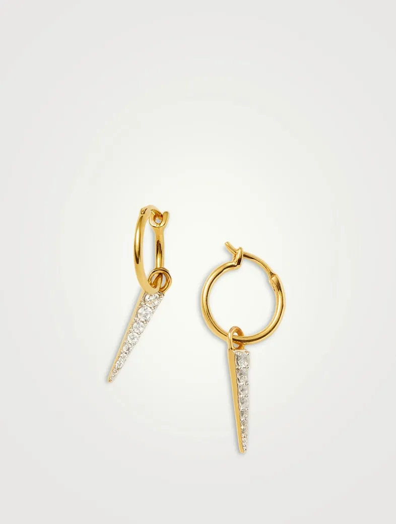 A distinctive addition to your ear stack. Suspended from small pared back hoops, these spike drop charms stand out with pavé detailing. Wear solo, contrast with a plain stud for added impact or opt for the pavé spike earring set. Remove the charms to wear the hoops solo. The size of this earring is best for those with smaller lobes, or perfect for second or third piercings.