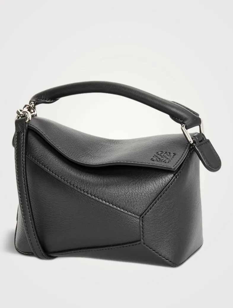 The Puzzle bag is the debut bag for Loewe by Creative Director Jonathan Anderson. A cuboid shape and precise cutting technique create Puzzle’s distinctive geometric lines. This mini version is crafted in classic calfskin with a herringbone-printed cotton canvas lining. A removable and adjustable strap allows for shoulder, crossbody, top handle, or clutch carry.