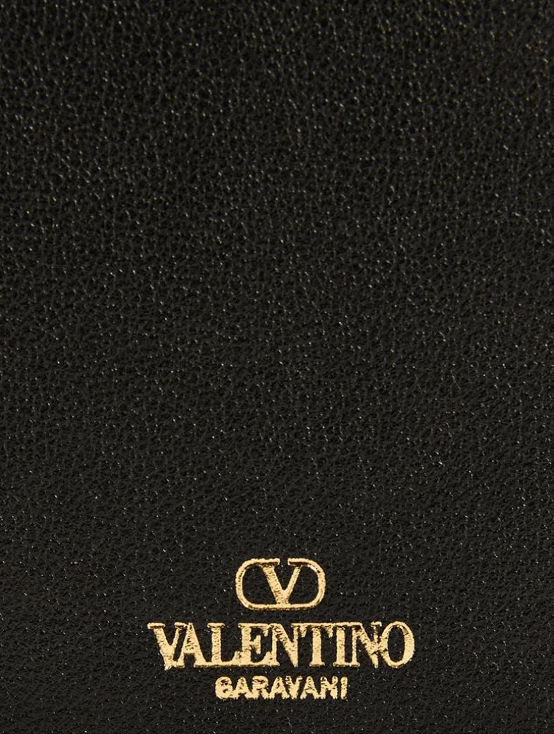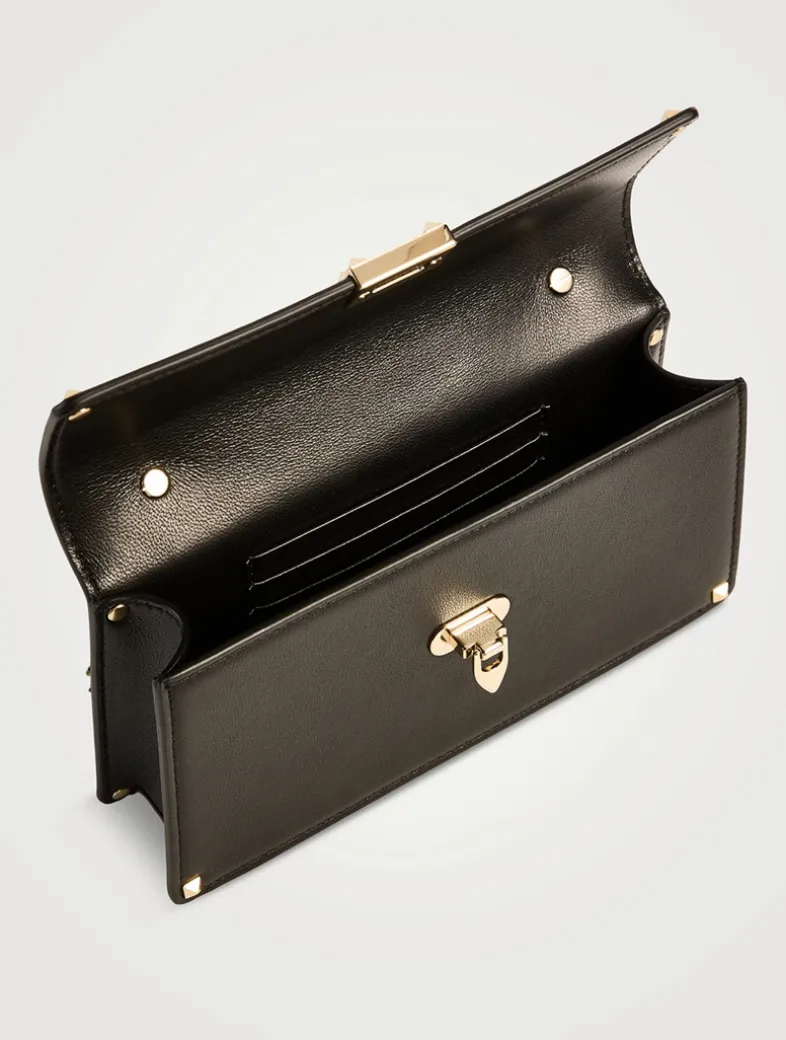 This structured bag is crafted in leather and features a flap closure with flip-lock hardware. It is topped with a fixed metal handle dotted with studs. Finished with a removable chain-link strap.