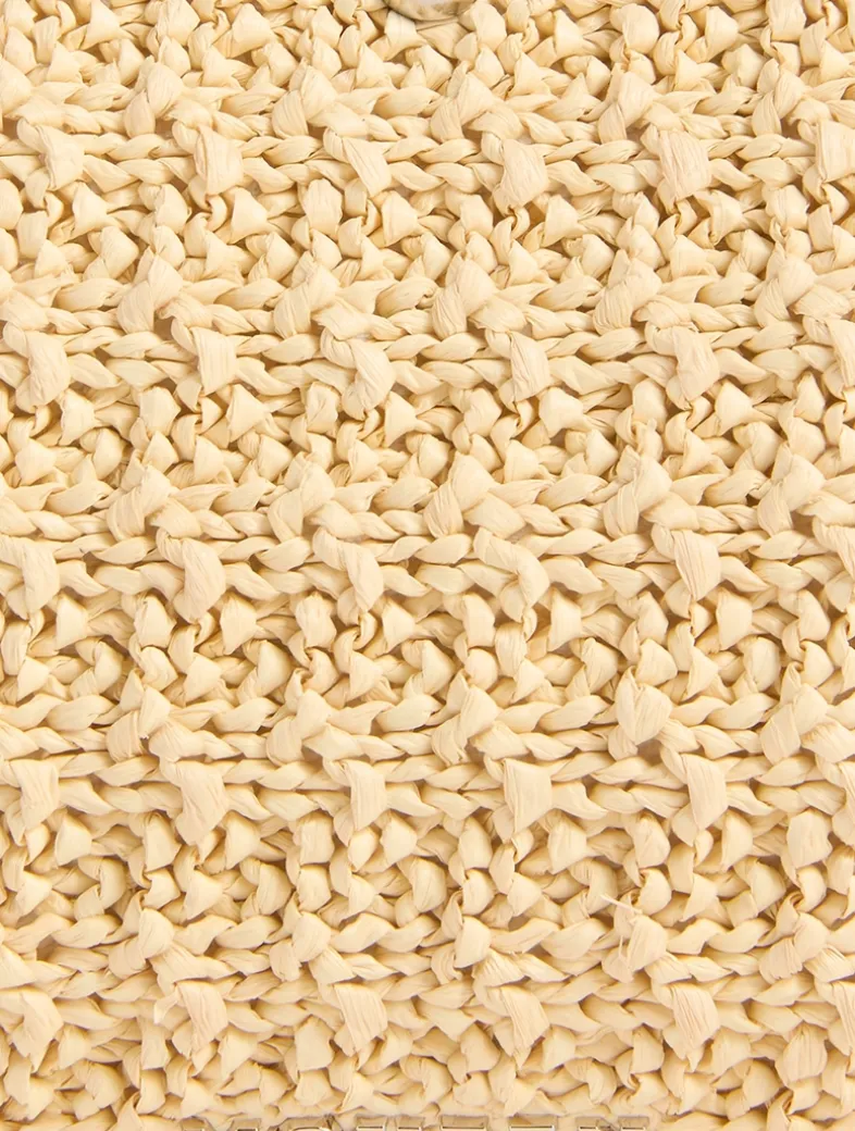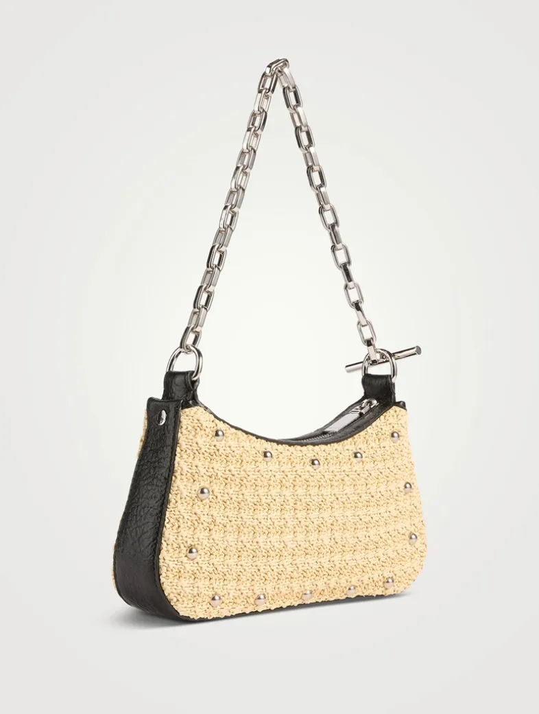 The McQueen T-Bar mini pouch has an elegant curved body in natural viscose raffia woven on knitting looms for a crochet-like effect, finished with grainy leather trims and shiny metal studs. Can be carried on the shoulder or in the crook of the arm by doubling up the metal chain strap ending with a signature T-Bar hook engraved with the McQueen logo. The bag has one central compartment and an internal card slot.