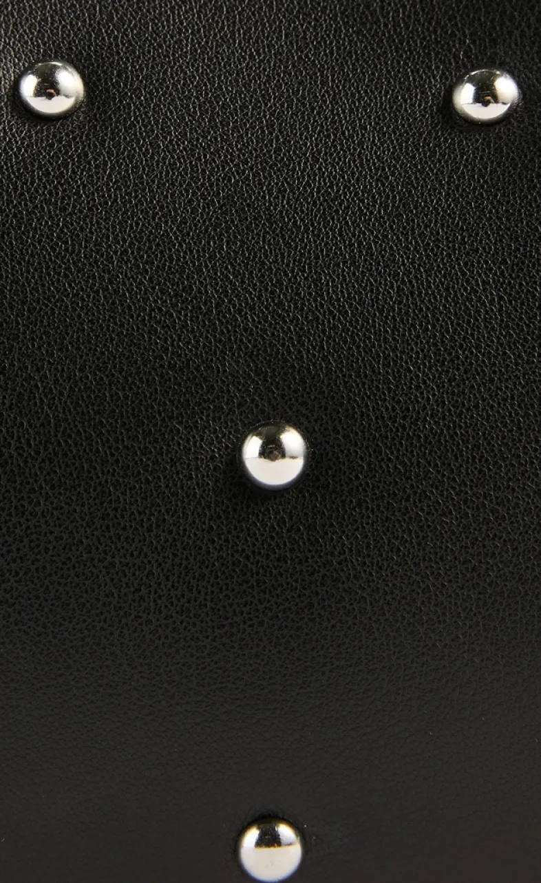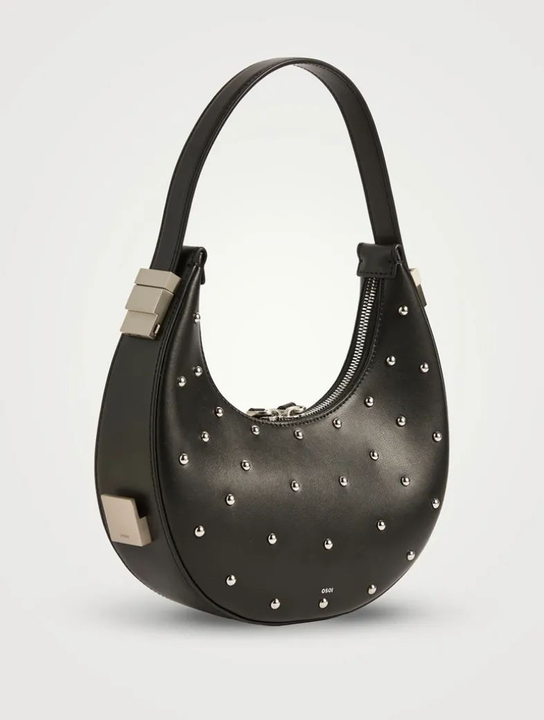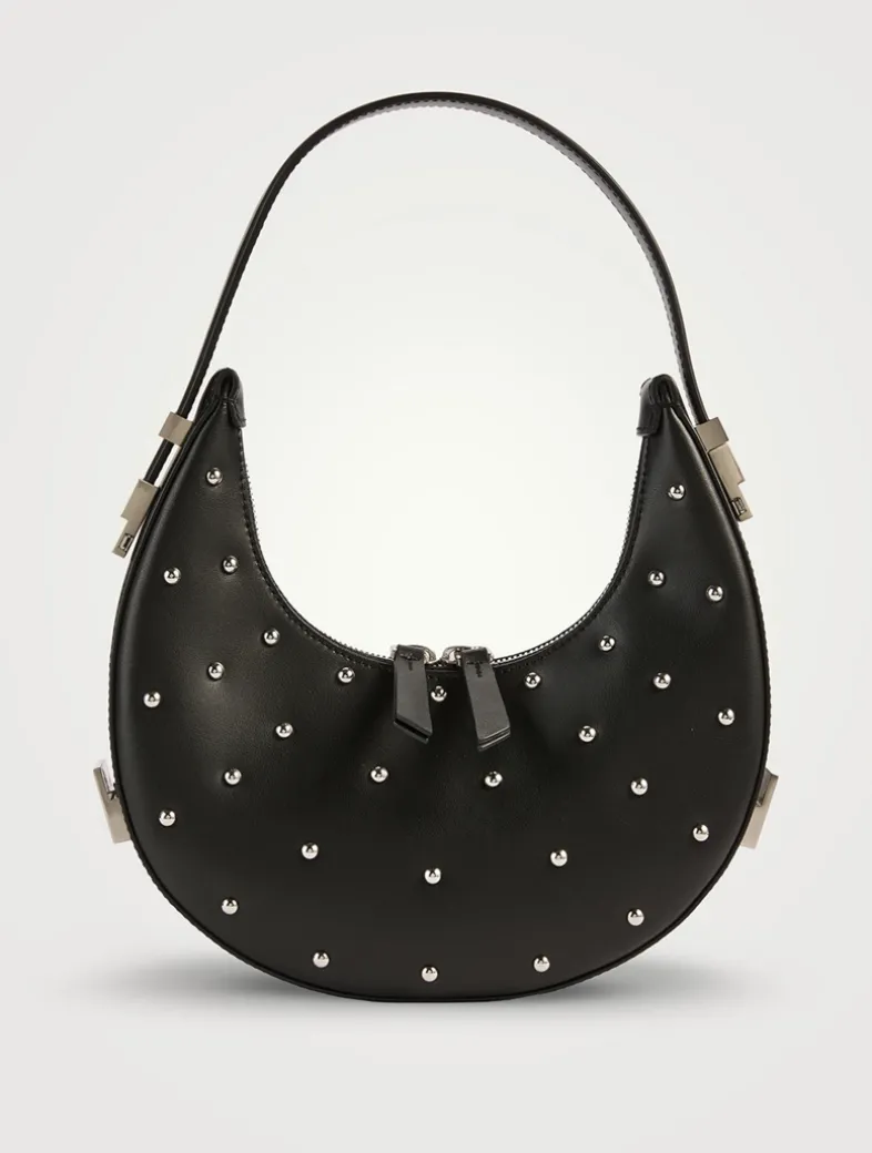 Crafted from leather dotted with studded hardware, this bag is designed with a curved silhouette and an adjustable shoulder strap. It is compact in size, light to carry, and has a soft and flexible touch.