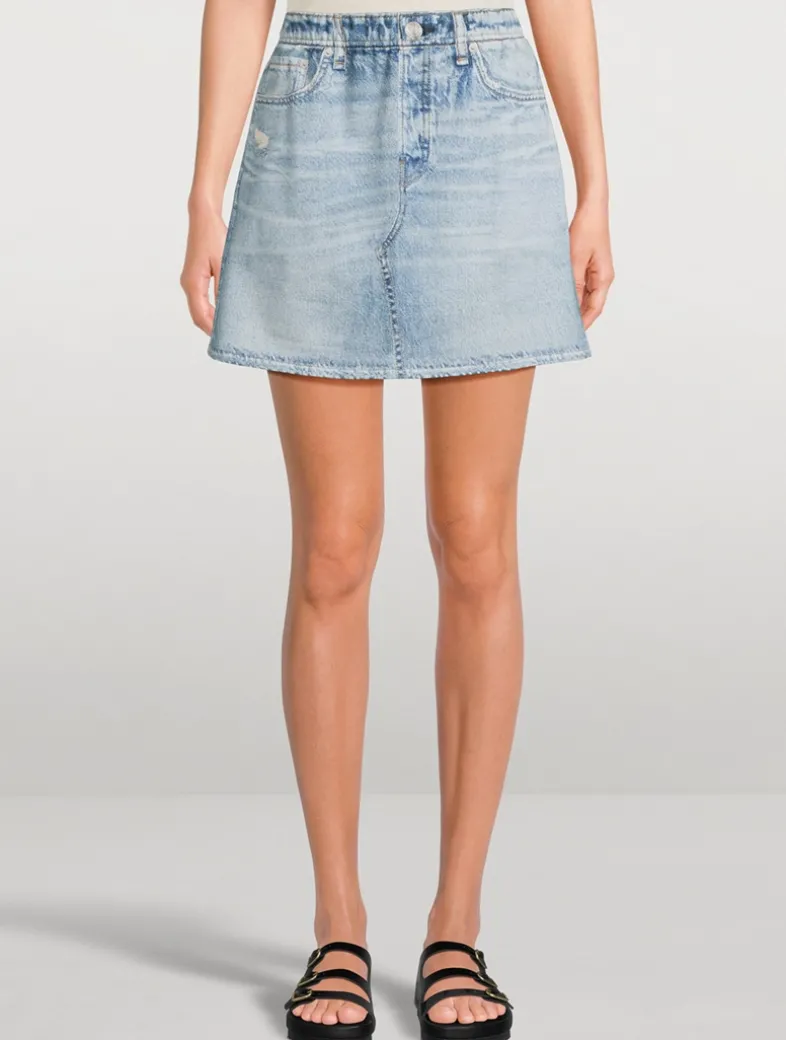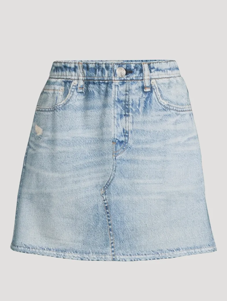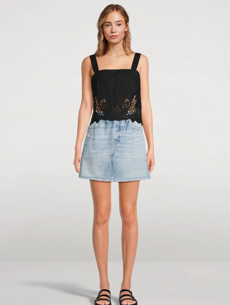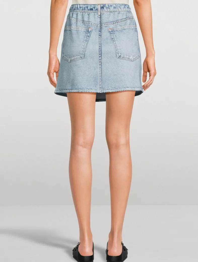 This cotton mini skirt is printed with a trompe l’œil motif, mimicking the look of denim. It has an elastic waistband and side seam pockets.