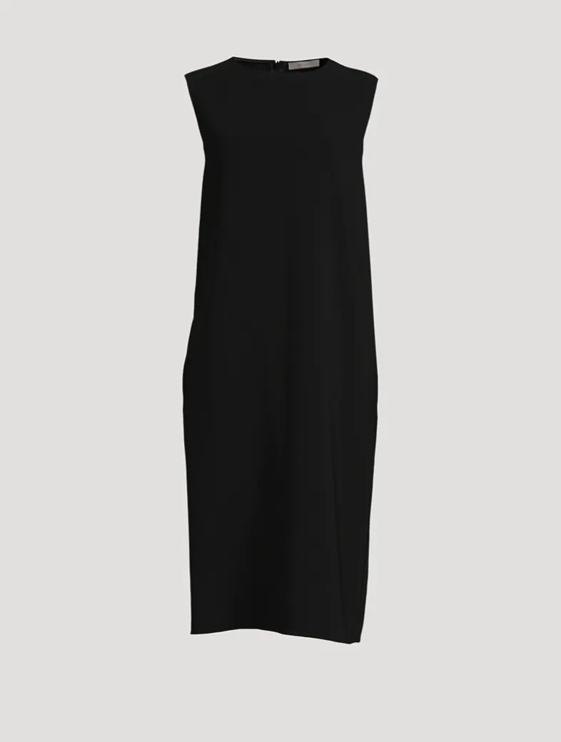 Made in Italy, this sleeveless mid-length dress is designed with a roundneck and back vent detail. Crafted in fluid cady, the silk-lined midi dress is finished with back zip closure and a straight silhouette.