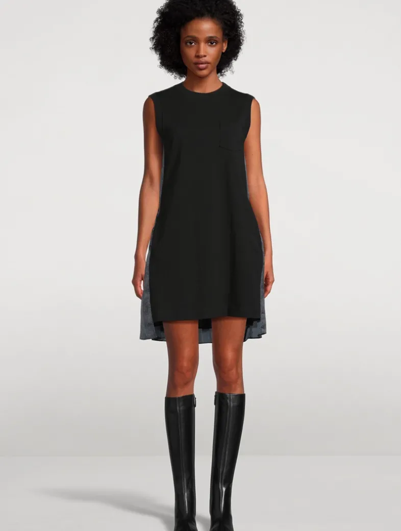 This sleeveless mini has a smooth front panel mixed with a pleated back. It is finished with a slim strap around the back waist that finishes with an adjustable buckle.