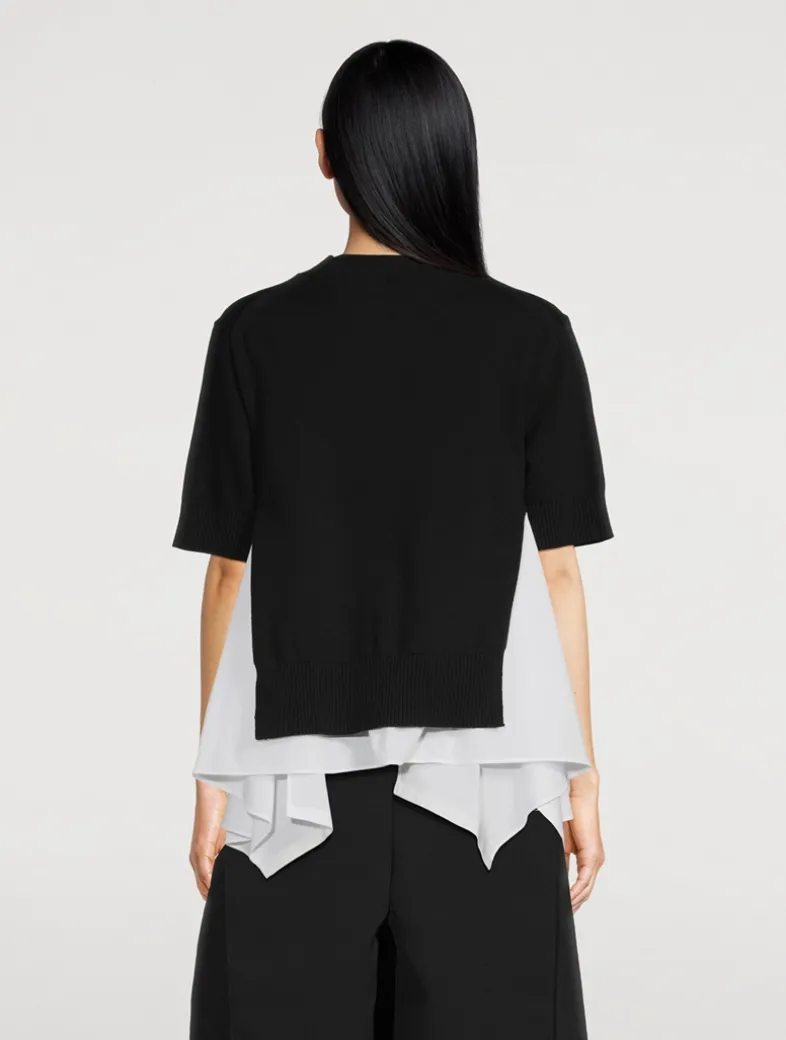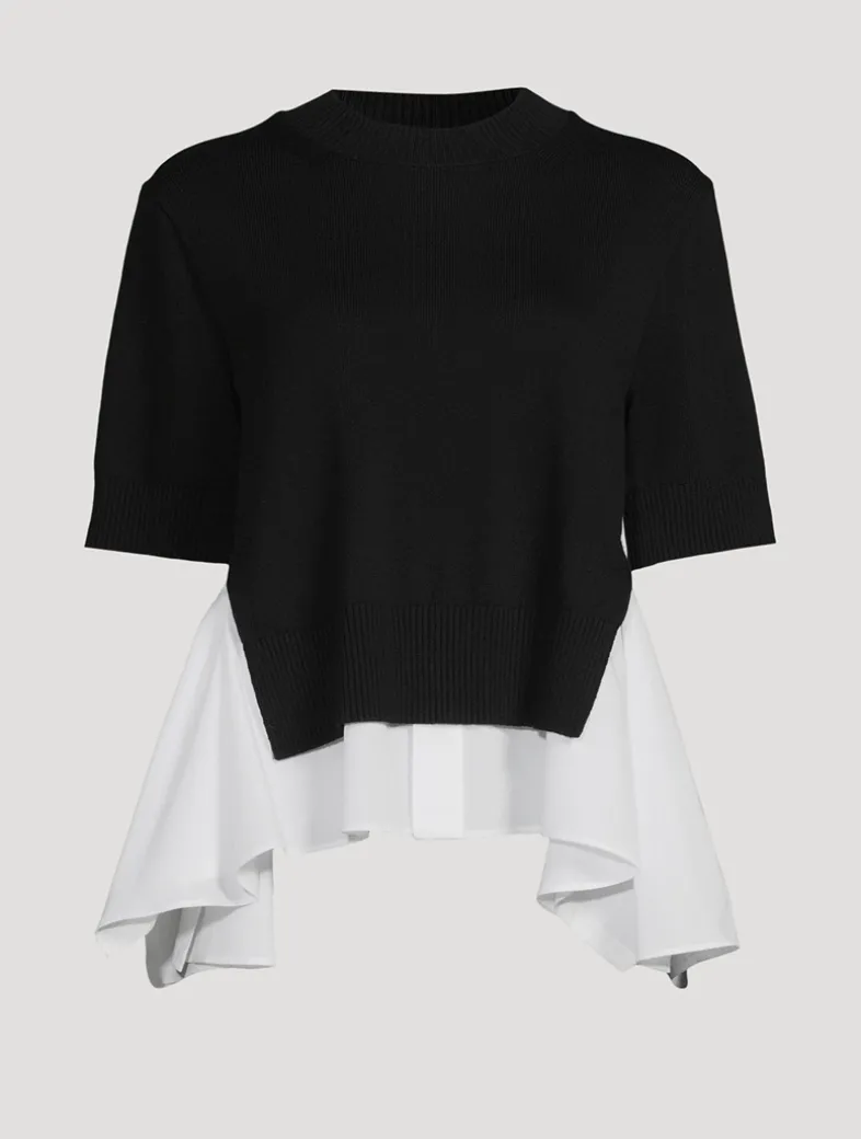 This short-sleeve knit pullover has ribbed trim at the collar, cuffs, and hem. The sweater is layered over a poplin shirt with button detailing and a high-low hem that flares over the hips.