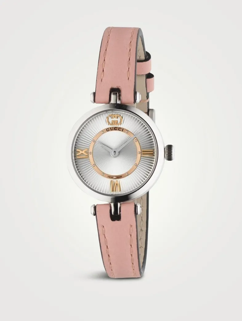 Accented with white resin stripes on the case side, this stainless steel watch features a silver soleil dial with pink gold galvanized indexes and hands. A slender calf leather strap completes the piece.