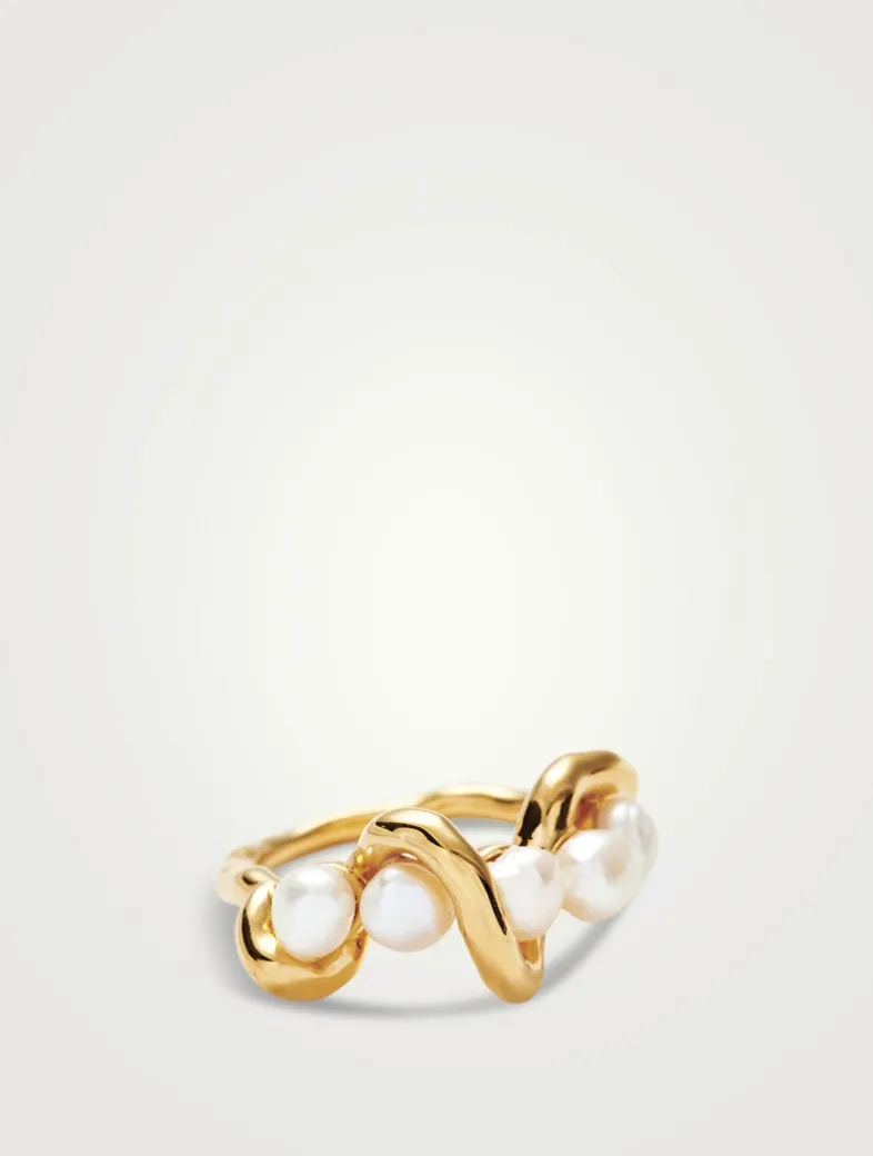 Iconic pearls for everyone. This pearl statement ring features a molten band twisted around beaded freshwater pearls, said to bring wisdom and knowledge. Style with other simple bands for a clashing ring stack.