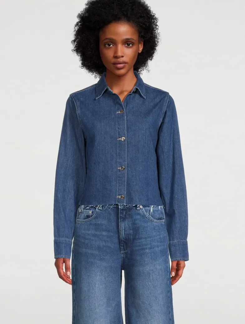 Montauk is a long-sleeve, button-down shirt with a boxy fit that is subtly cropped. In a classic stretch denim with authentic character, it is finished with a raw-edge hem.