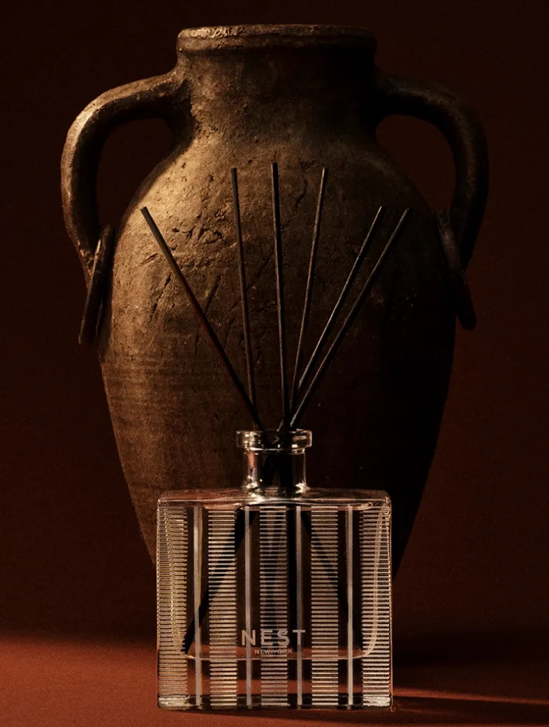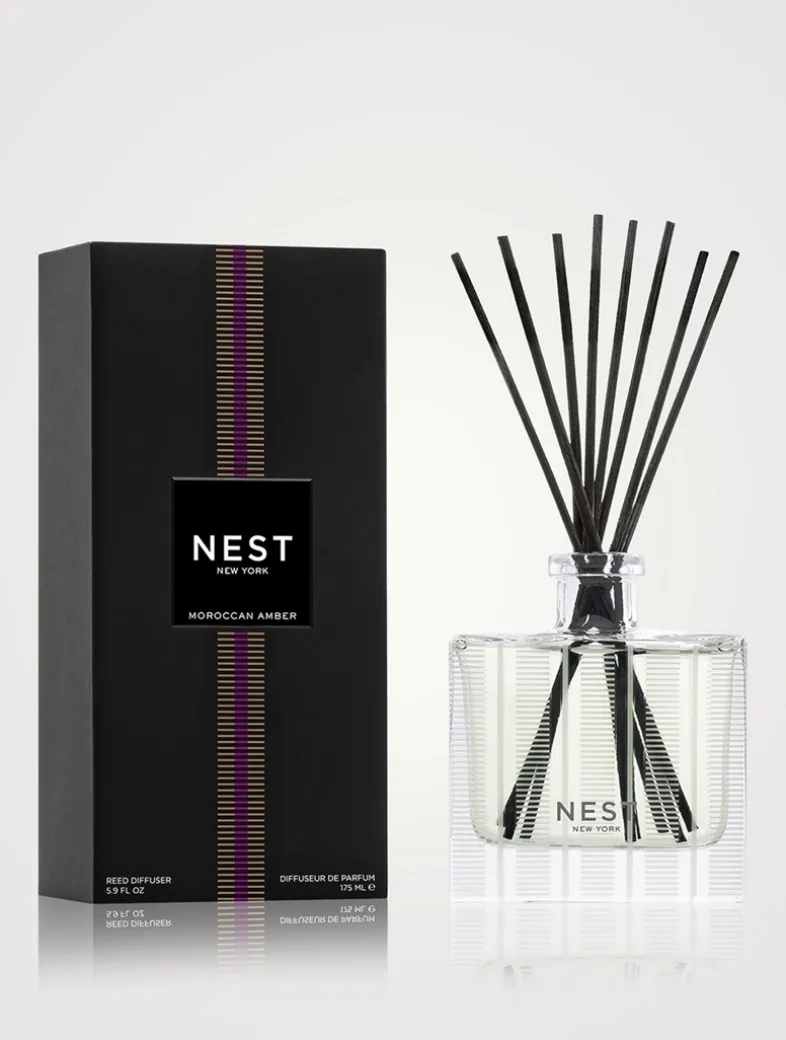 Create an exotic atmosphere with this exquisitely fragranced Reed Diffuser featuring Moroccan amber, sweet patchouli, heliotrope, and bergamot with a hint of eucalyptus. Matches not required.